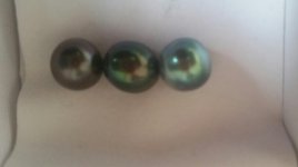 After lots of emails and photos, we decided on a 9.2mm deep blue green oval for the centrepiece. It's seriously mesmerising, the depth of colour is sublime! It is flanked by two gorgeous keshi, both flashy light green with hints of pink and gold. Both are fun, baroque shapes and around 6-6.5mm. The end keshi are a tiny 2.5mm. I love that even the tiny end keshi are so bright and colourful.