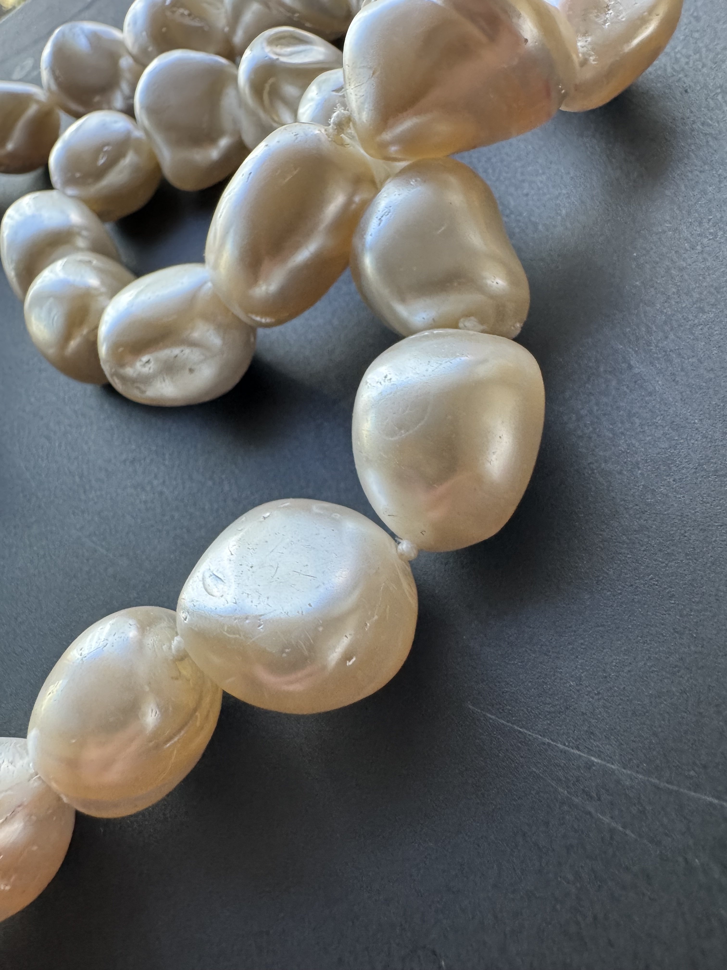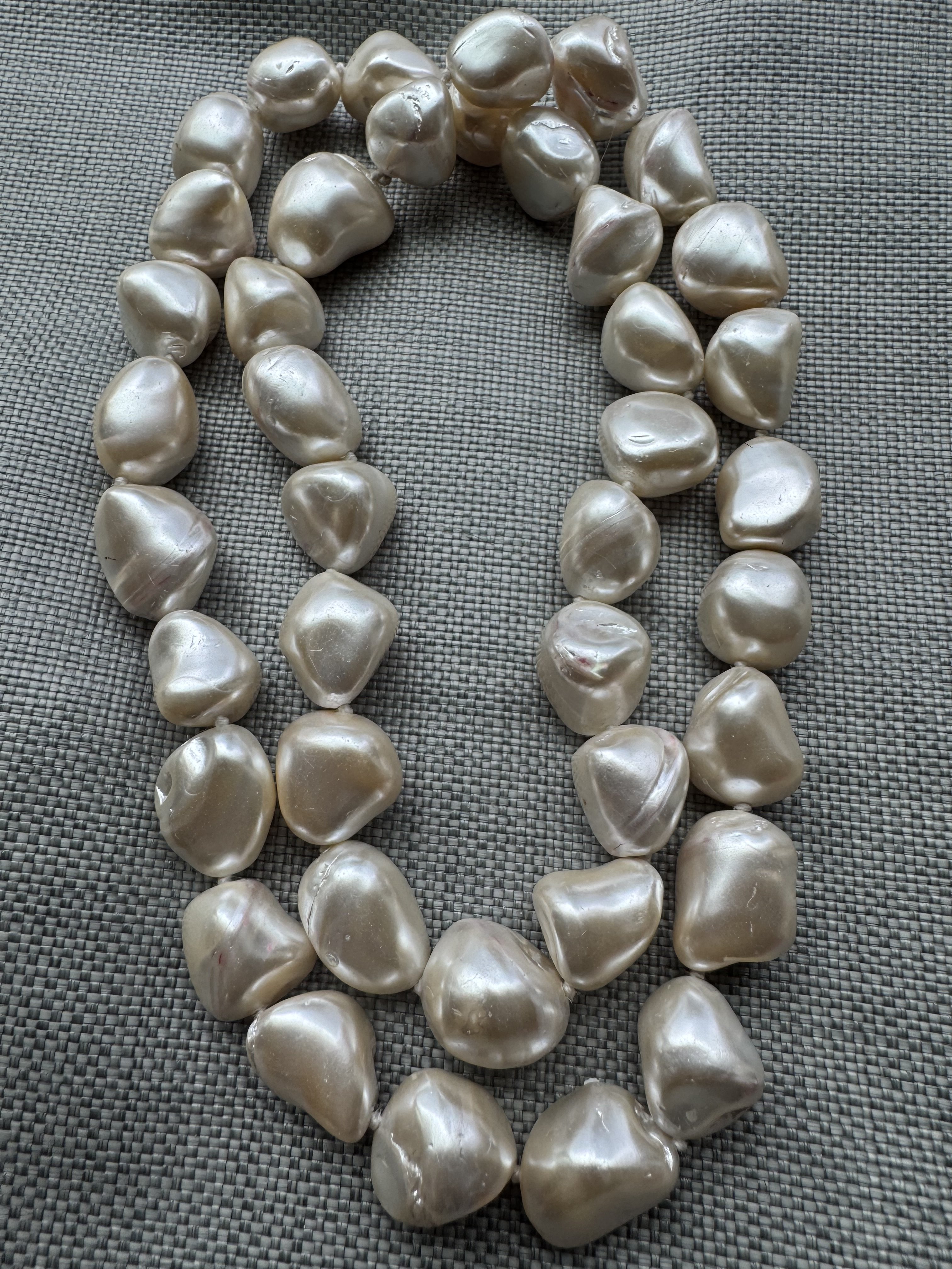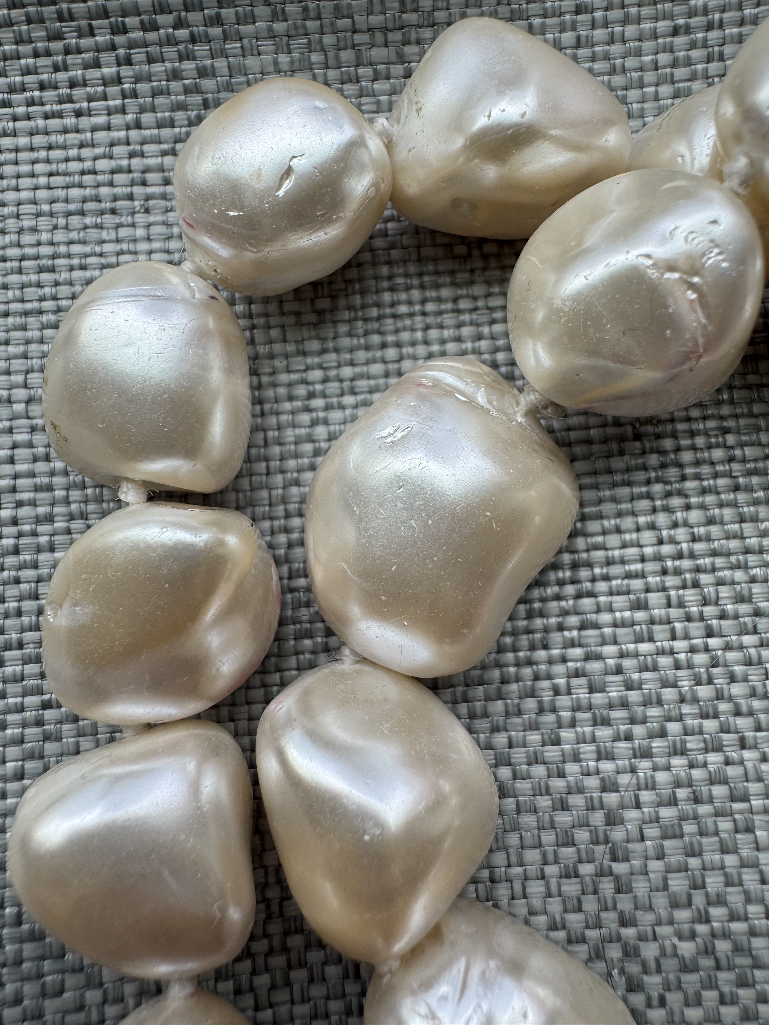 I have this raw hank of pearls with knots in between them, no clasp, On average they measure 20mm across drill hole. They are very dense and feel like picking up rocks. The 40 pearl strand weighs a considerable 265 grams. They are gritty against teeth. Each pearl varies on the strand.