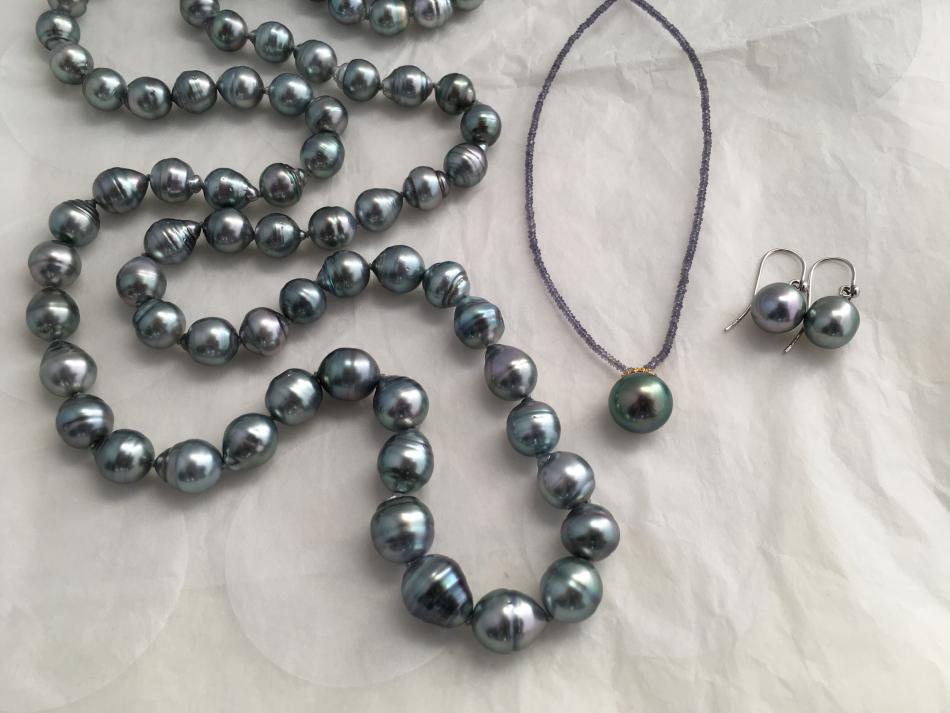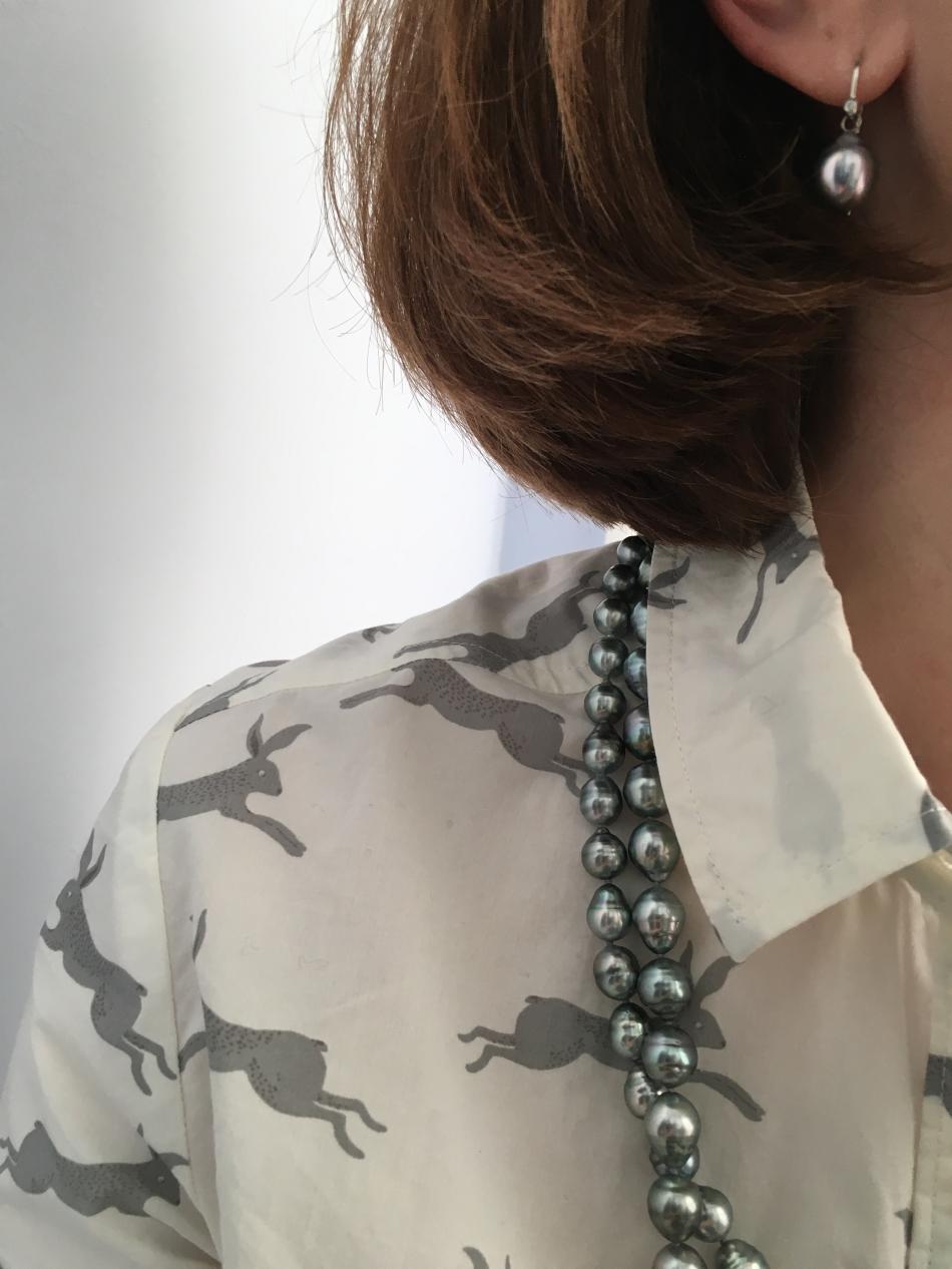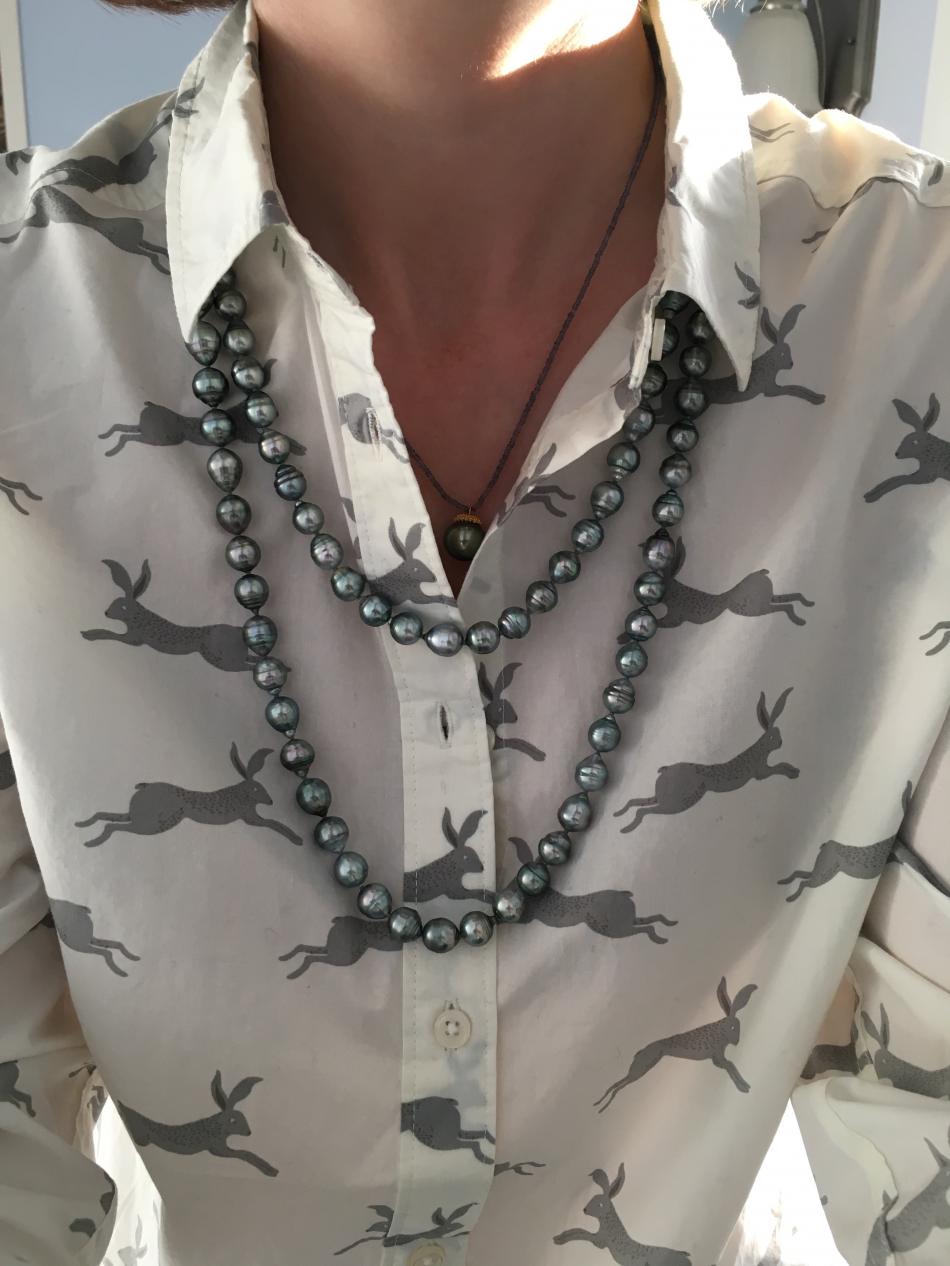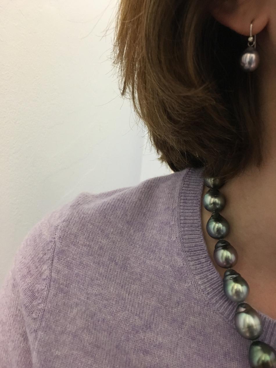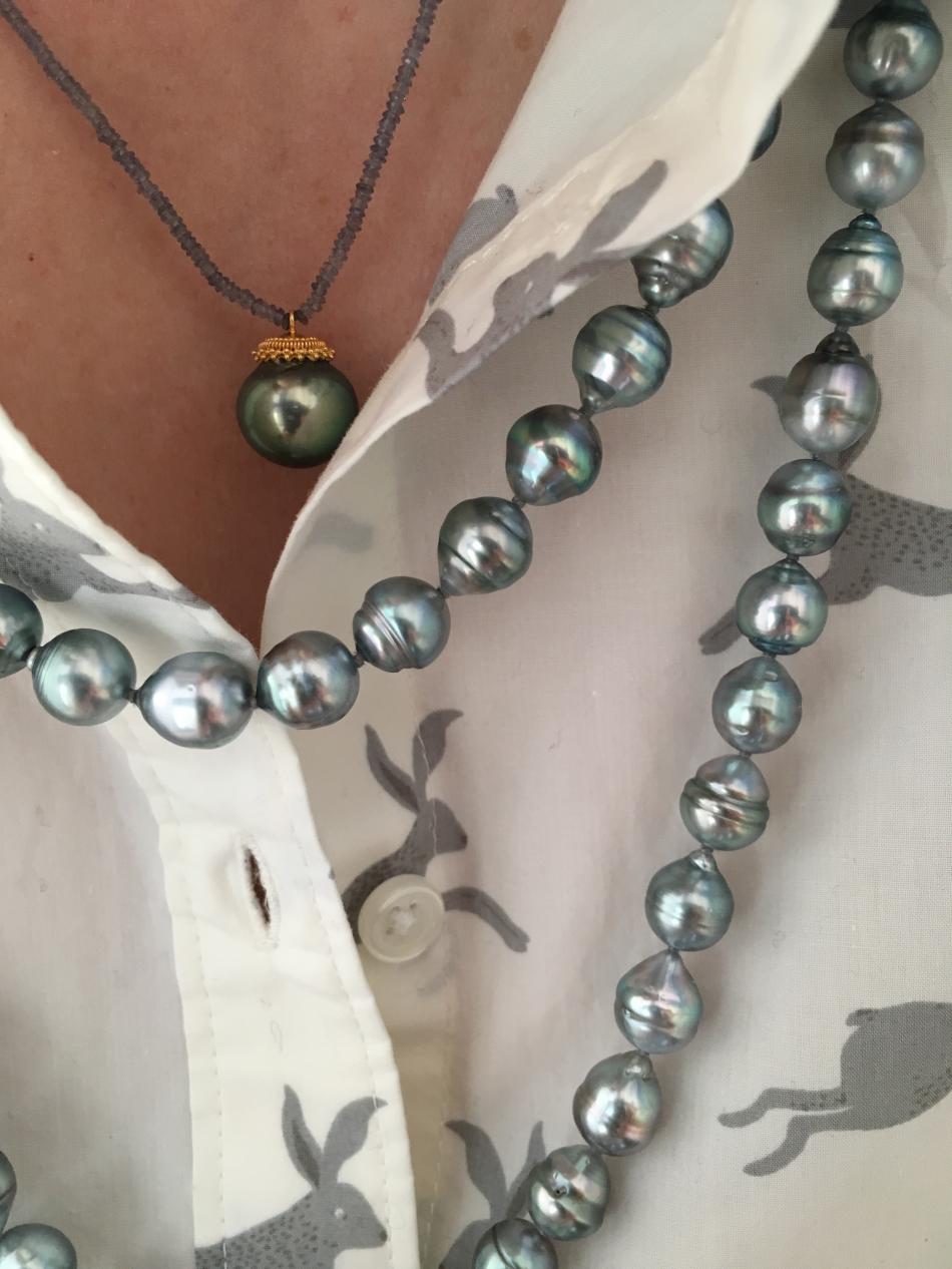 We decided at the last minute to go to a nice restaurant and I needed to upgrade my family's appearance in a hurry so I slipped a short sleeved button down over my older son's long sleeve top, a nice-but-comfy top onto little brother, and some fancy pearls for me: Golay Easter egg Tahitians and Tahitian drops from Pearl Paradise. (Hubby dressed himself.)