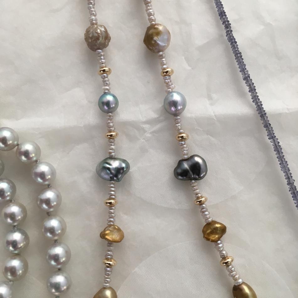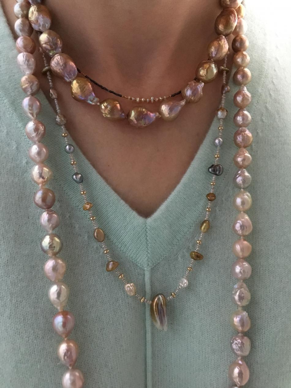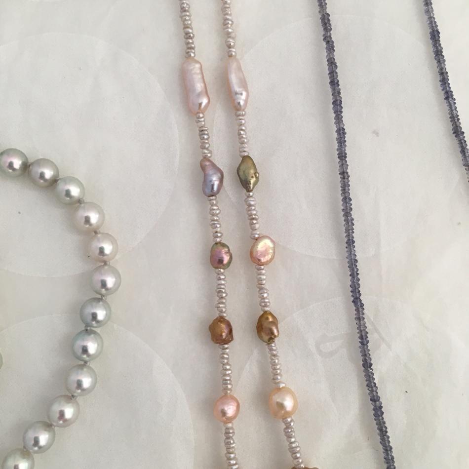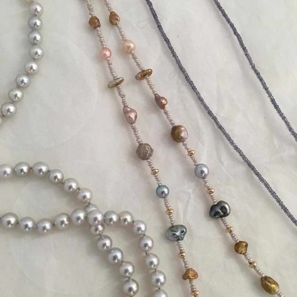 Tiny South Sea akoya choker from Kojima Pearl, metallic ripples from Catherine Cardellini, feather pearl necklace from Kojima Pearl, 50" lavender ripple rope from Catherine Cardellini.