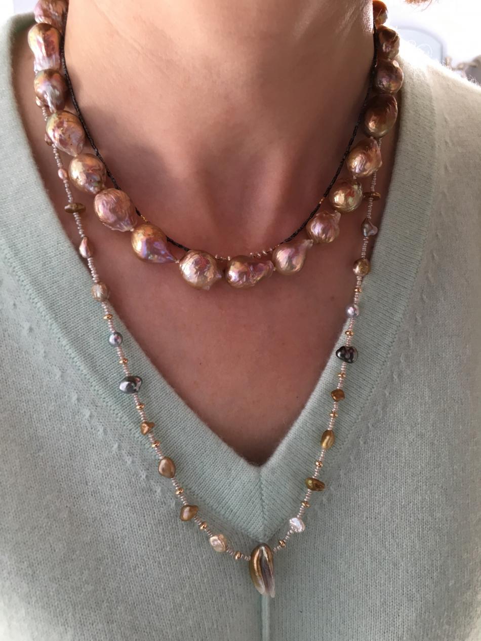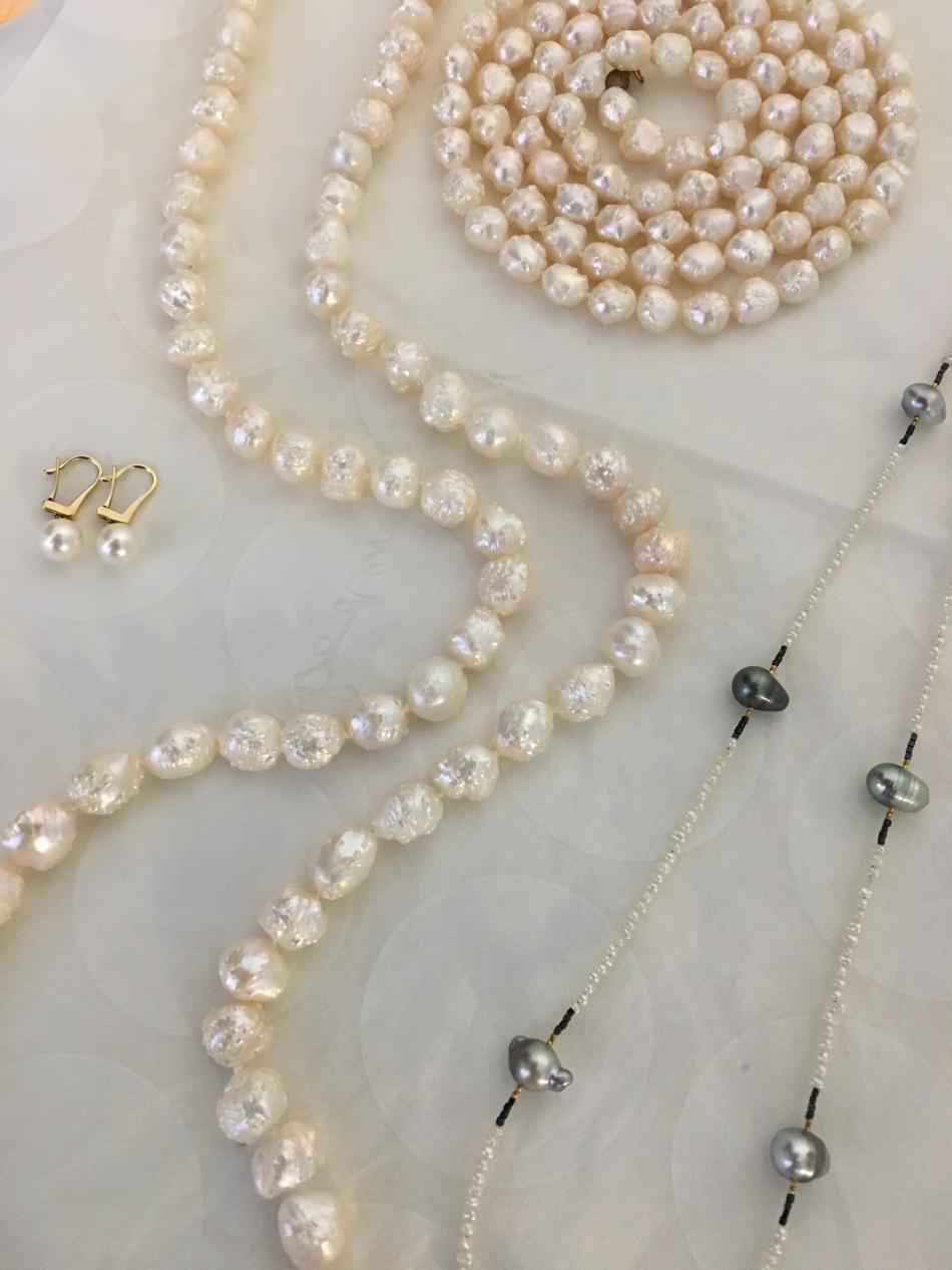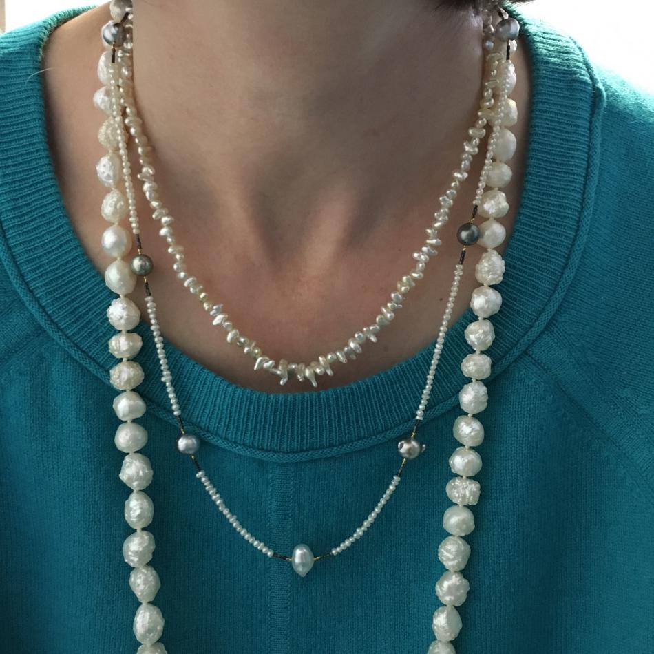 Tiny South Sea akoya choker from Kojima Pearl, metallic ripples from Catherine Cardellini, feather pearl necklace from Kojima Pearl, 50" lavender ripple rope from Catherine Cardellini.