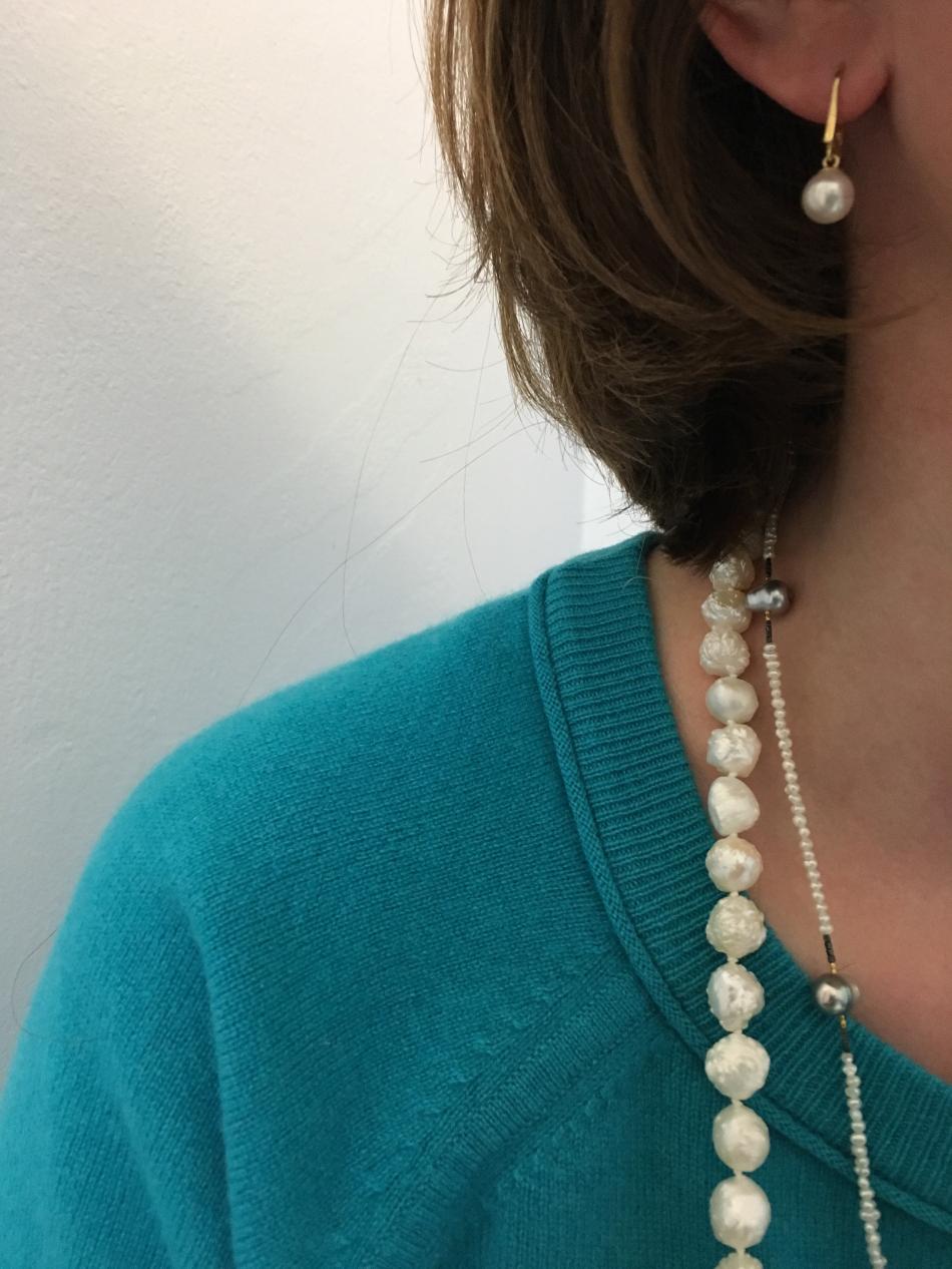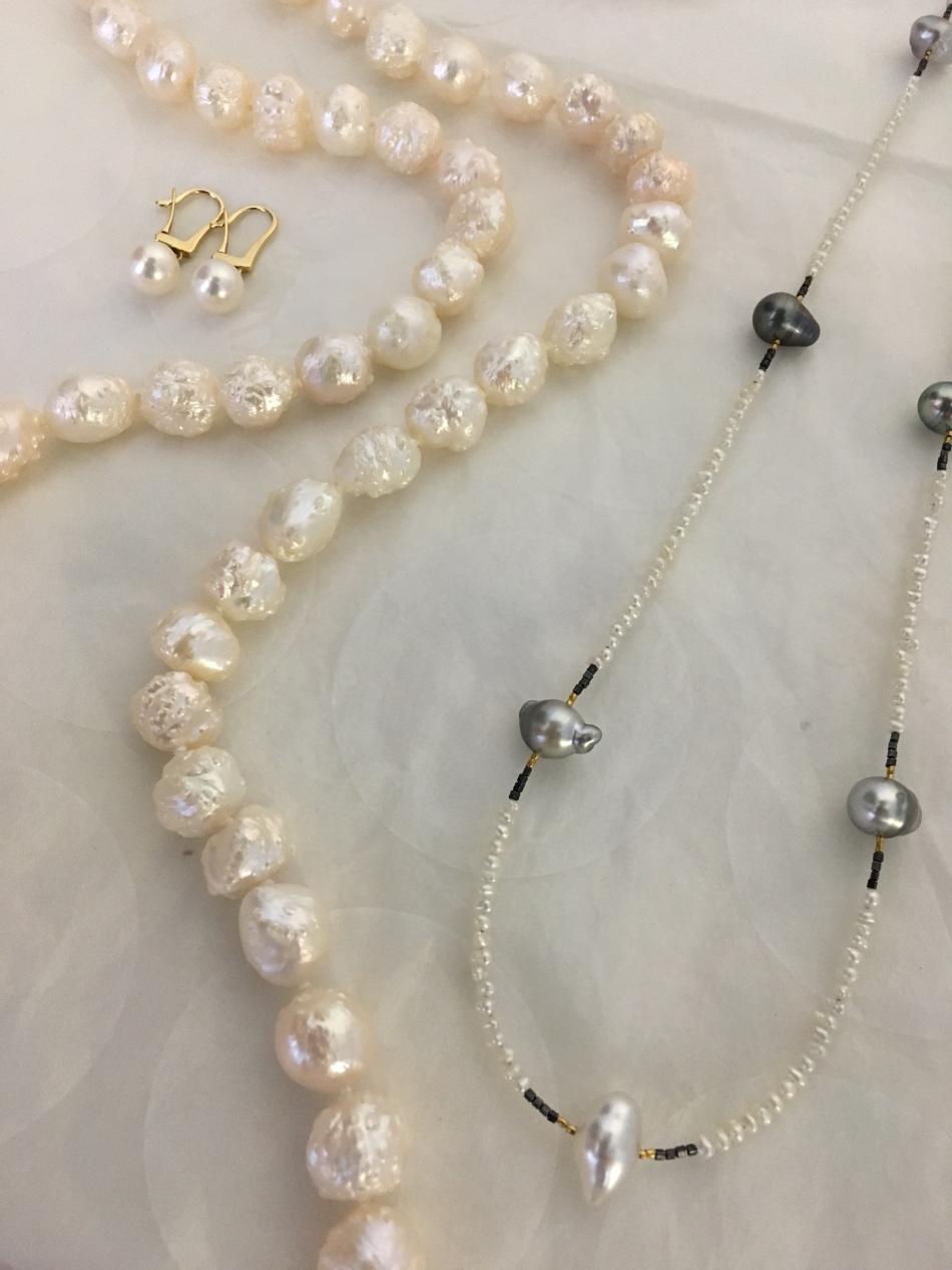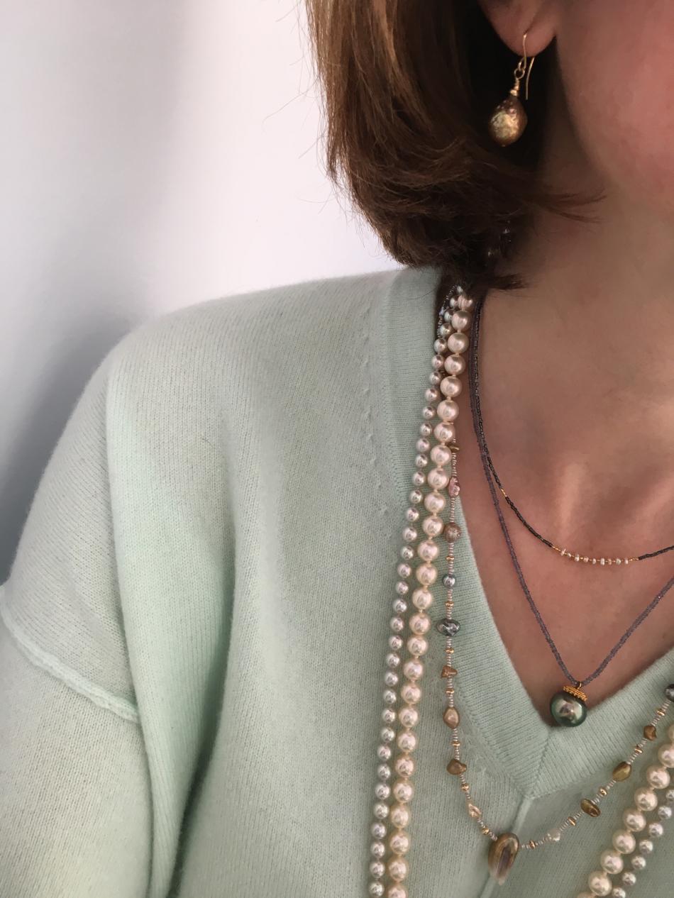 Tiny South Sea akoya choker from Kojima Pearl, metallic ripples from Catherine Cardellini, feather pearl necklace from Kojima Pearl.
