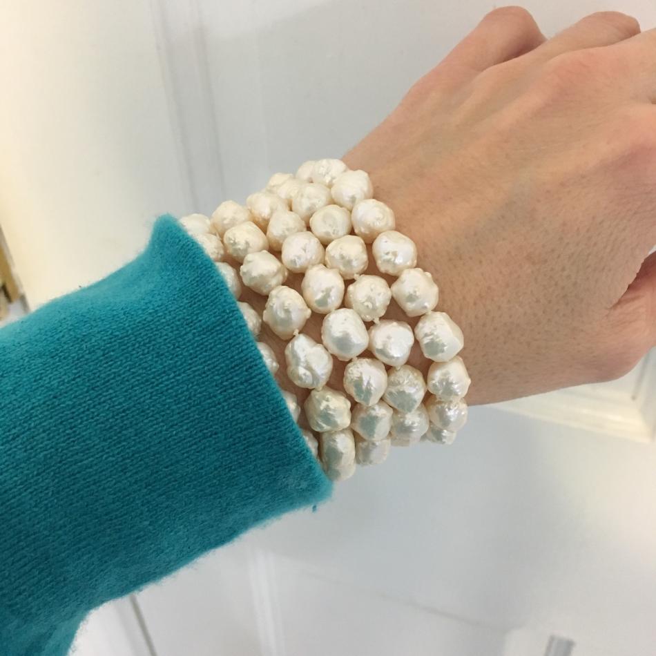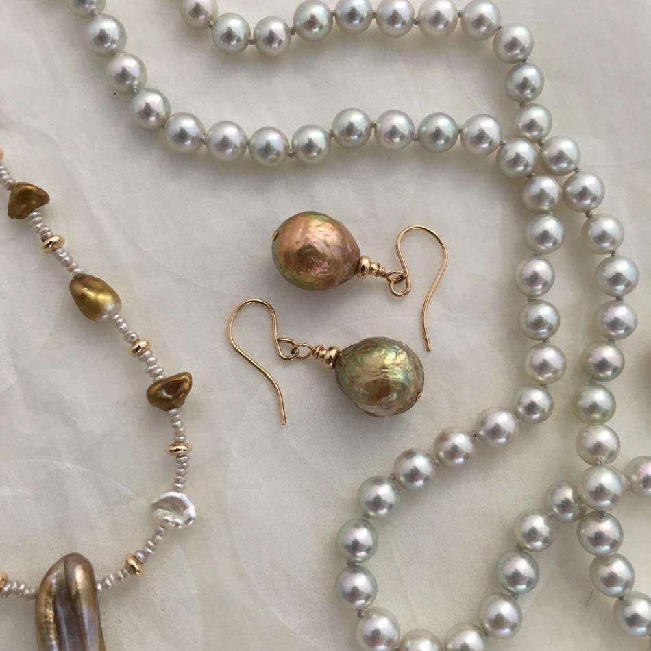 Rosebud Pearl rope, Tahitian Keshi station necklace, and akoya Keshi necklace from Kojima Pearl, freshwater dangles from Pearl Paradise. I felt like a rosebud bracelet as well so I wrapped a rope of them from Lilia's Treasures around my wrist : )