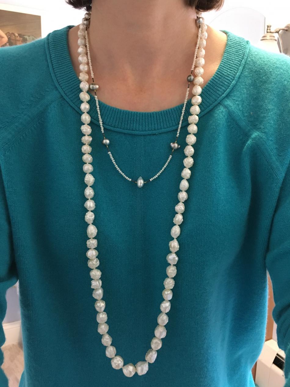 As I mentioned earlier, I started out just wearing the rosebud Pearl rope and Tahitian Keshi station necklace above and then added the 18" akoya keshi necklace.