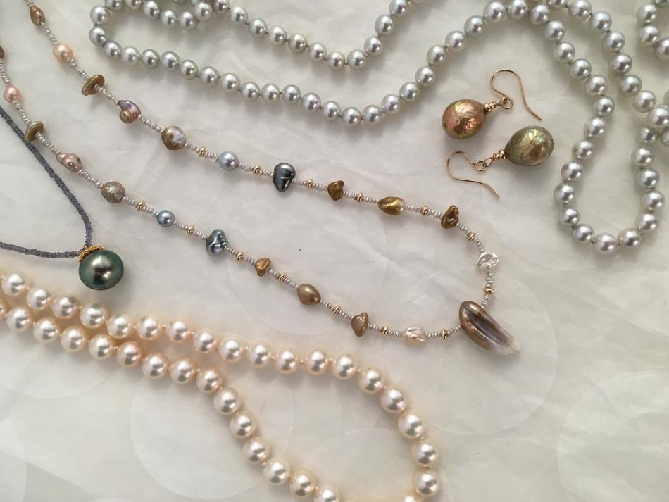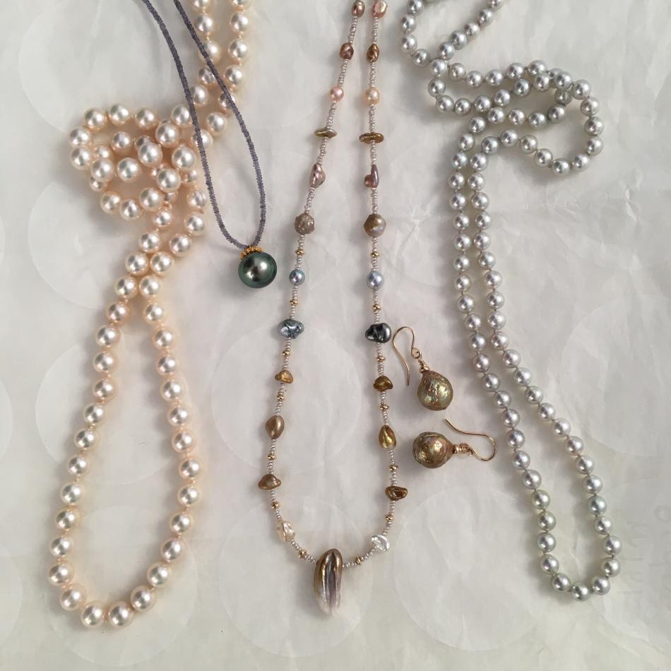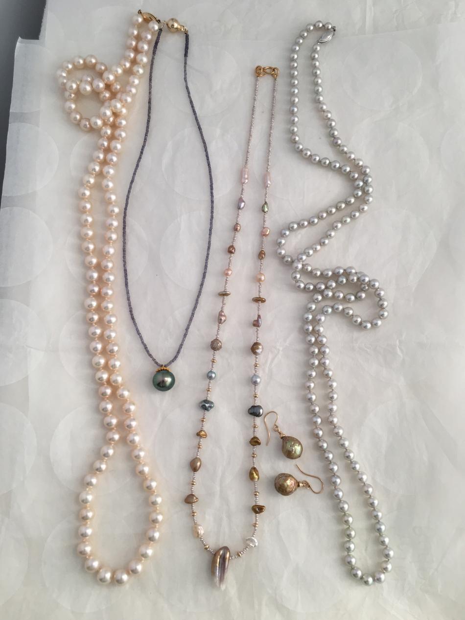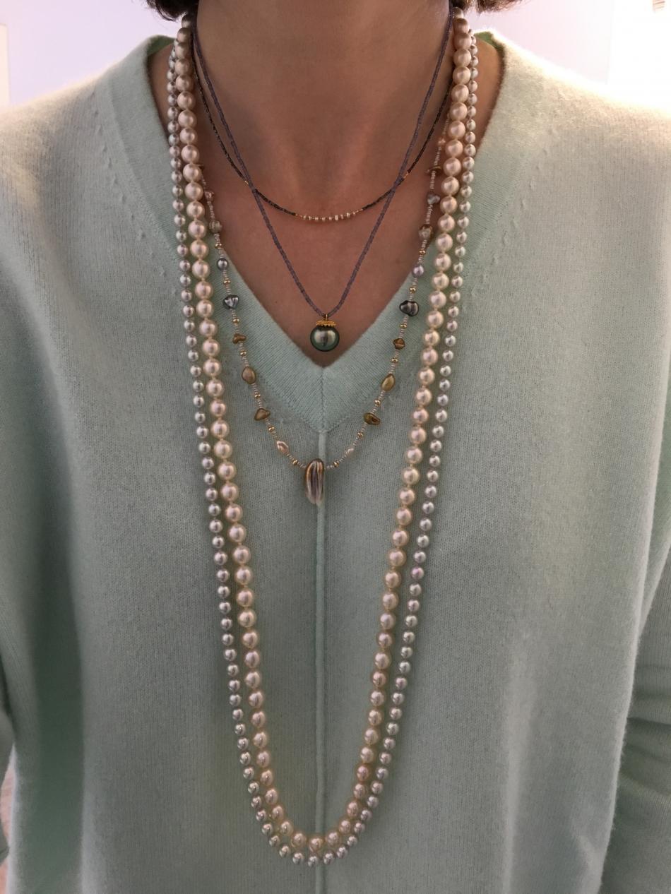 Tiny South Sea akoya Keshi choker from Kojima Pearl, Tahitian pendant on iolite from Kojima Pearl, feather pearl necklace from Kojima Pearl, metallic white fwp rope from Pearl Paradise, pistachio akoya rope from Hisano of little h Jewelry.
