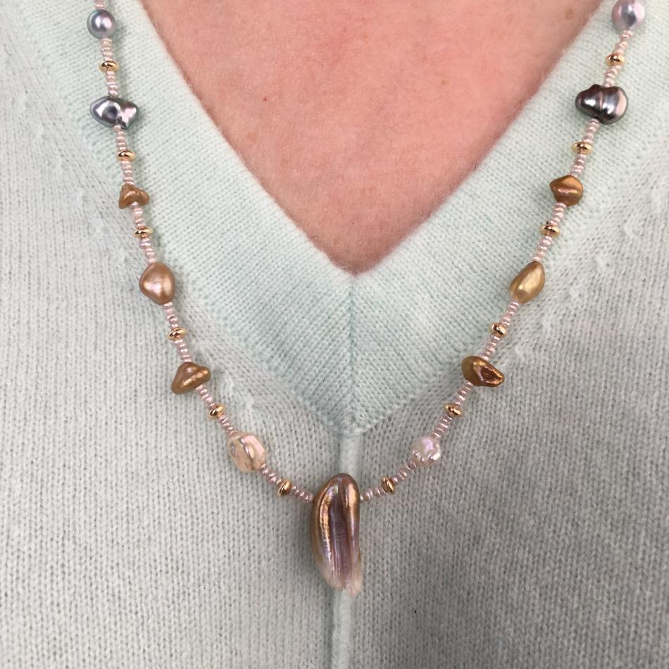 My feather pearl necklace from Kojima Pearl arrived yesterday: 23" long and made up of freshwater, Japan akoya, Japan Kasumi, and Tahitian pearls. It's very delicate with lots of interesting colors and textures; I love it!