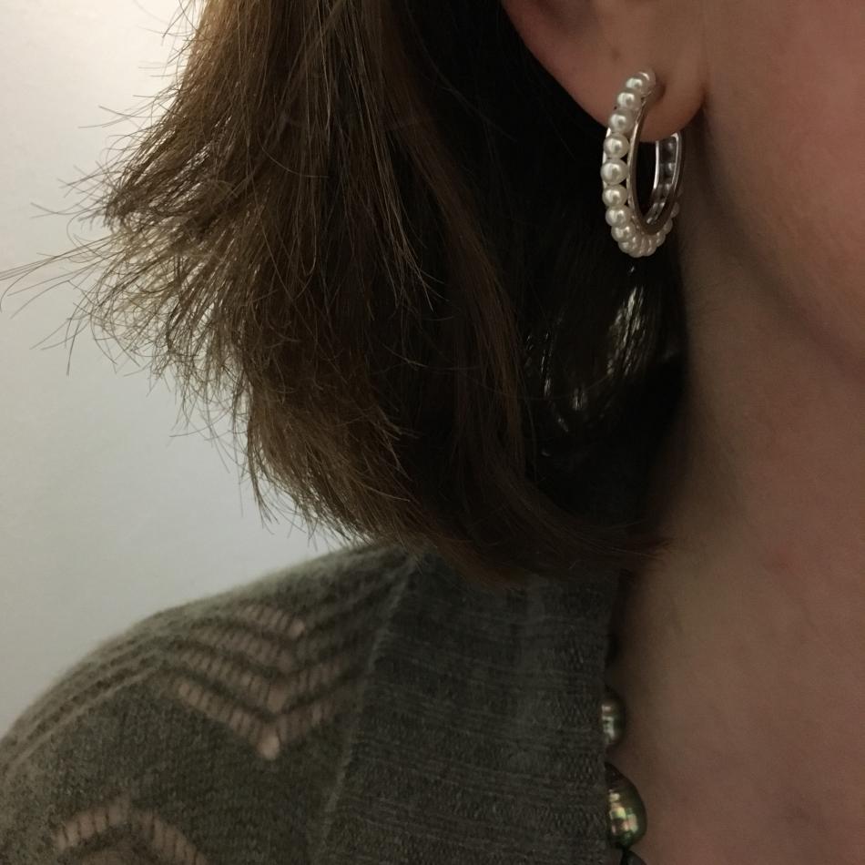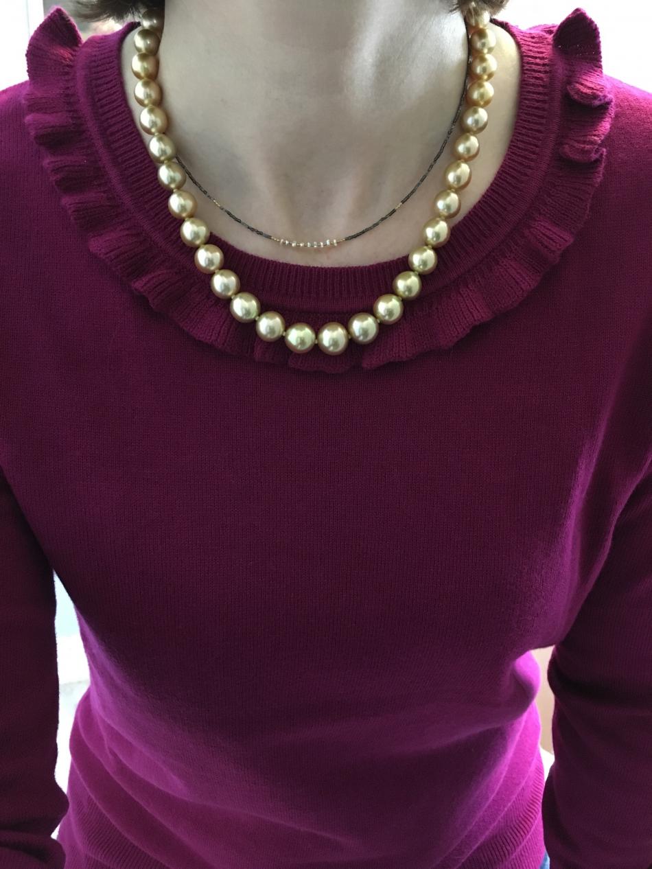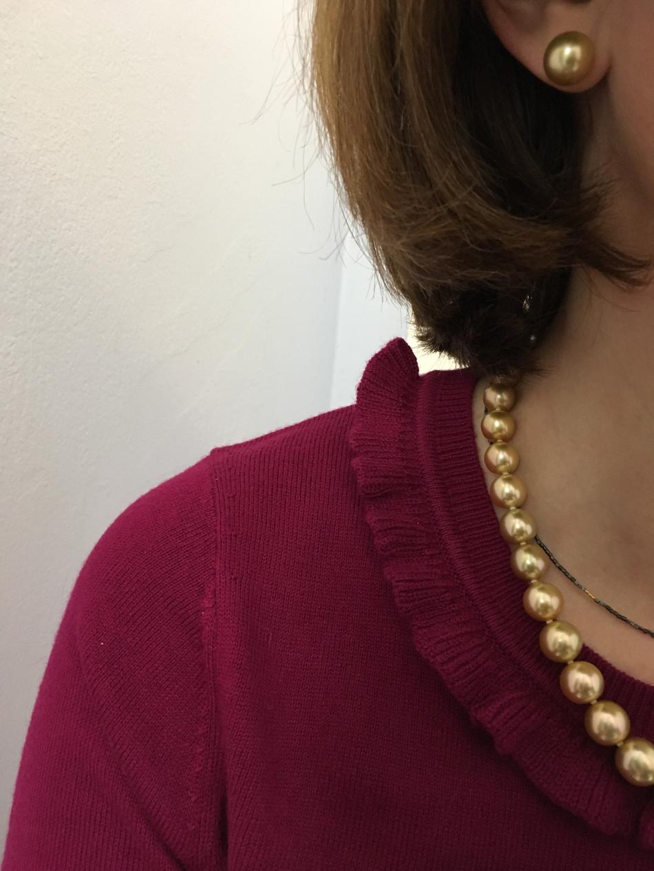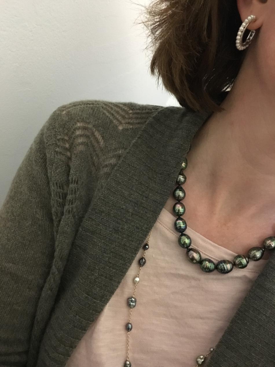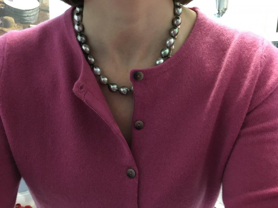 I also got the sweater in light grey, and it looked great with pearls, but the sleeves were an inch tighter than the purple and the turquoise, versions which I also bought. So the grey got sent back. The other sweaters I ordered (crown, dog, hearts) were all size M, and just that bit too tight, so they got sent back, too.