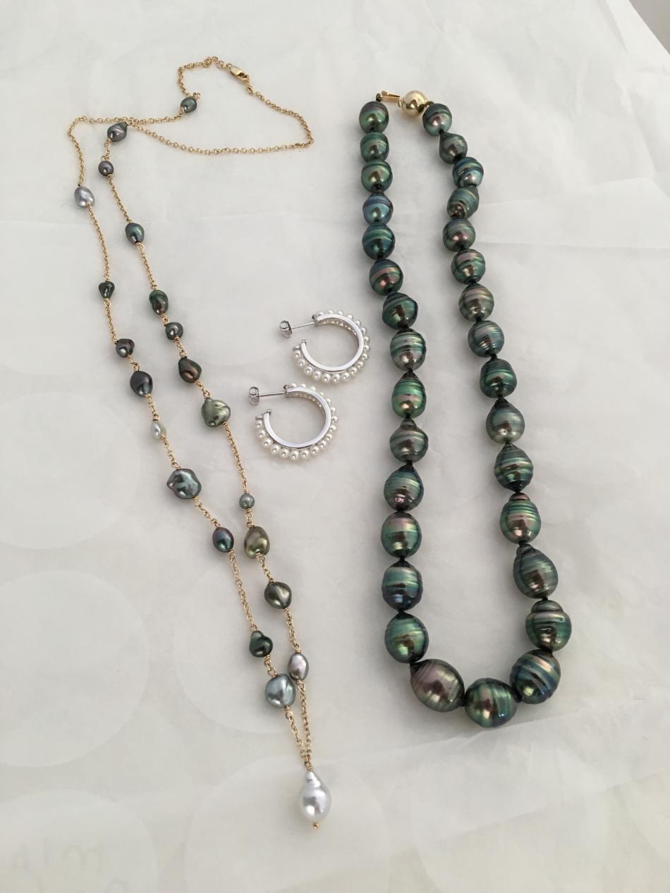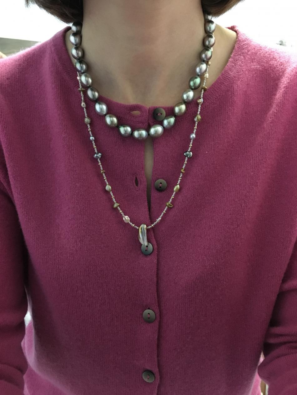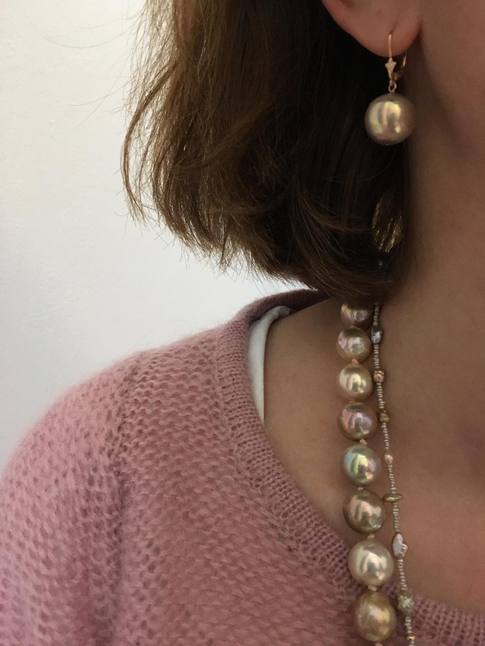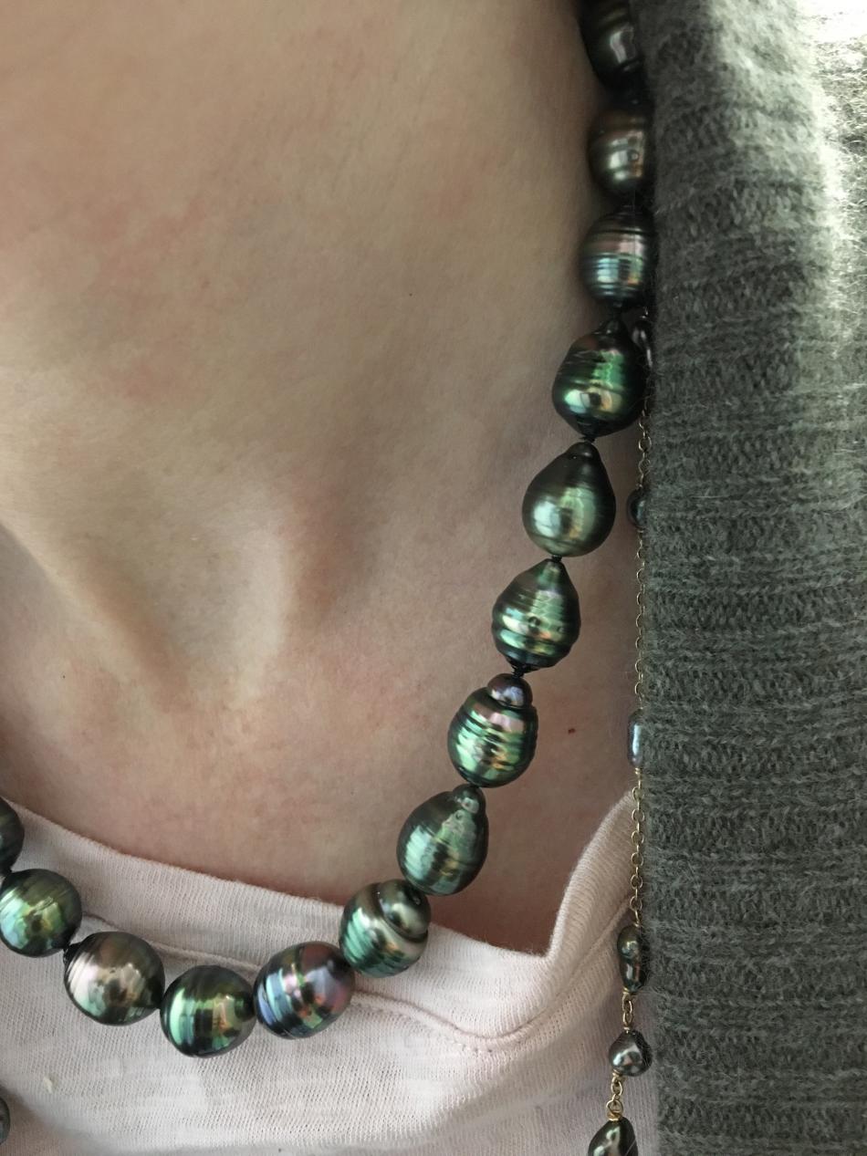 I also got the sweater in light grey, and it looked great with pearls, but the sleeves were an inch tighter than the purple and the turquoise, versions which I also bought. So the grey got sent back. The other sweaters I ordered (crown, dog, hearts) were all size M, and just that bit too tight, so they got sent back, too.