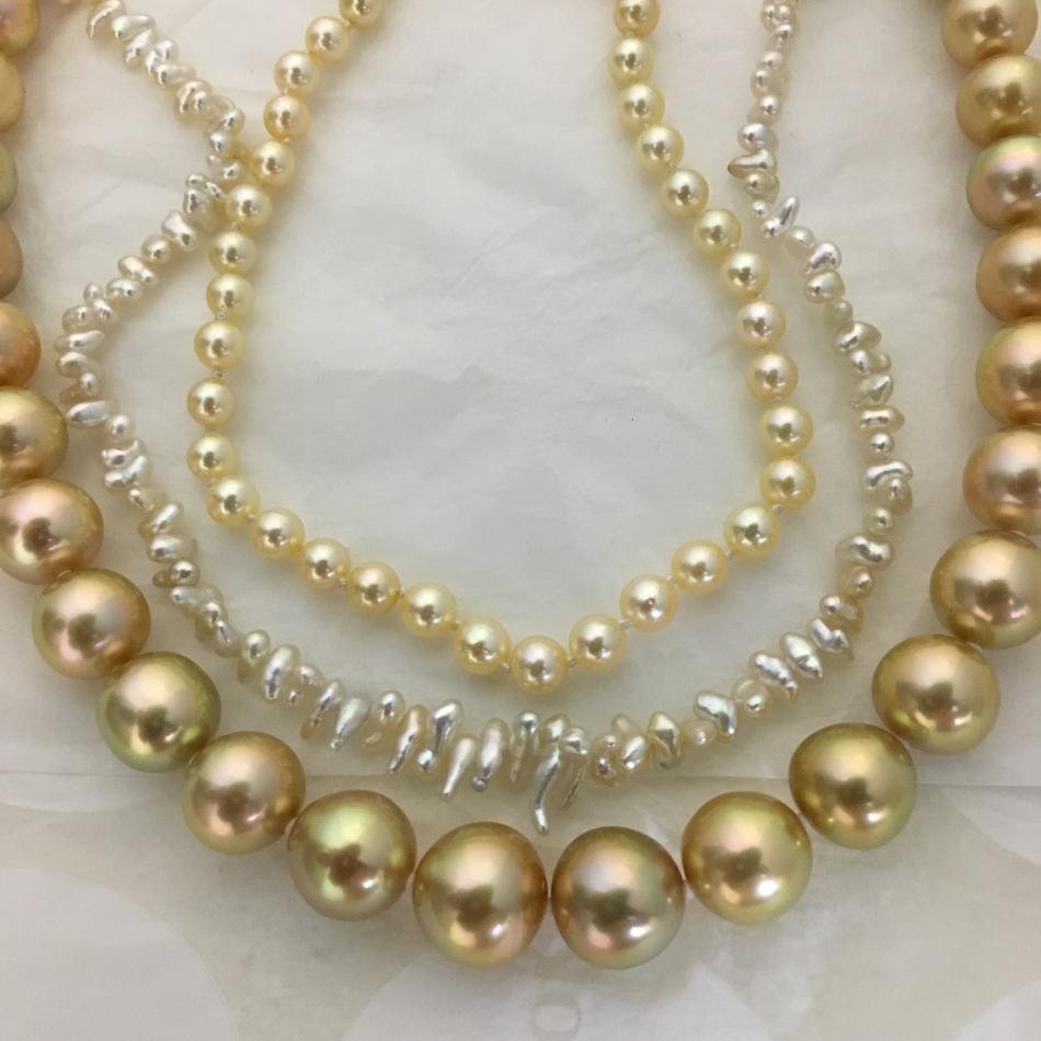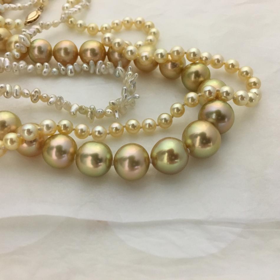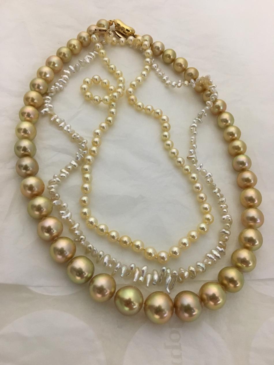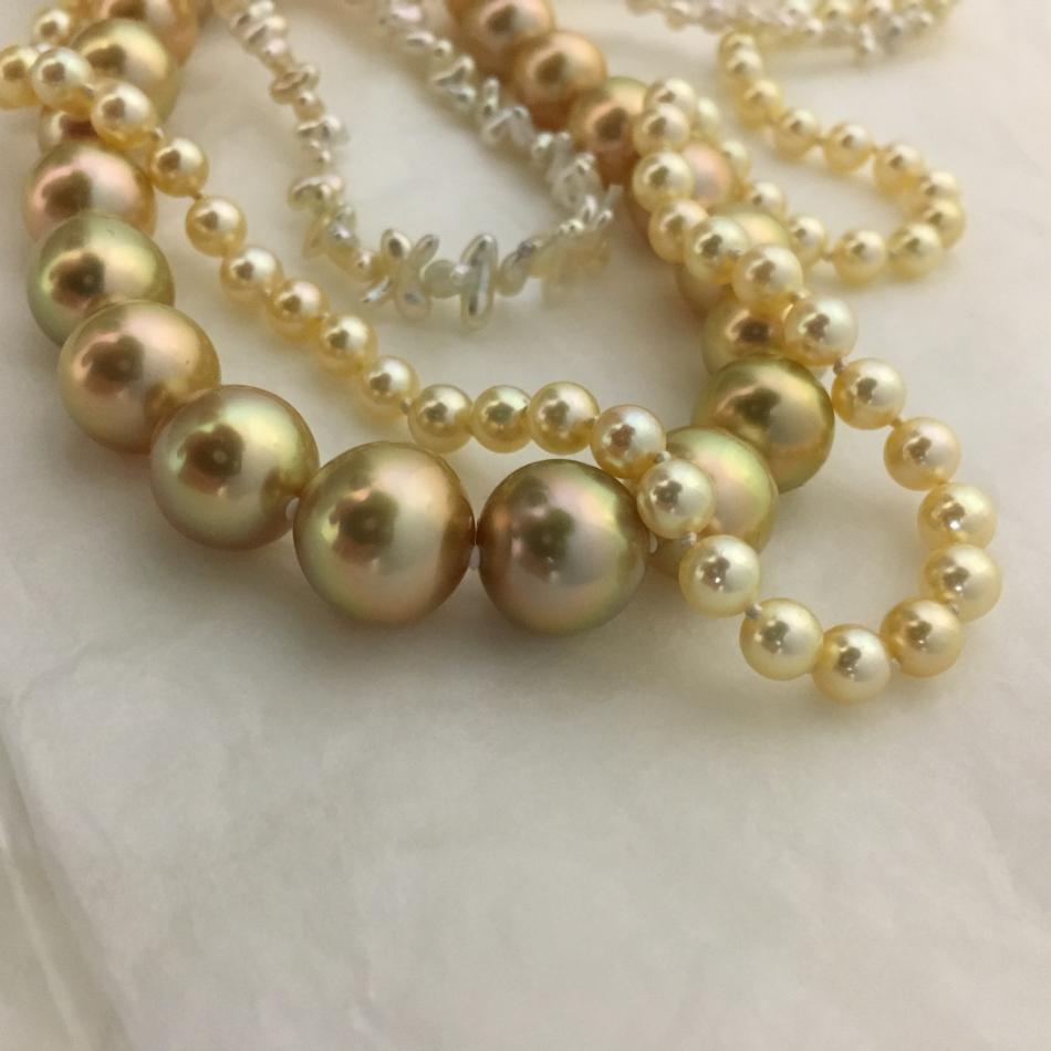 The akoya keshis have such amazing luster and I love how you put that together! It brings out the gold in the akoyas and is a great combination of texture. Great job!