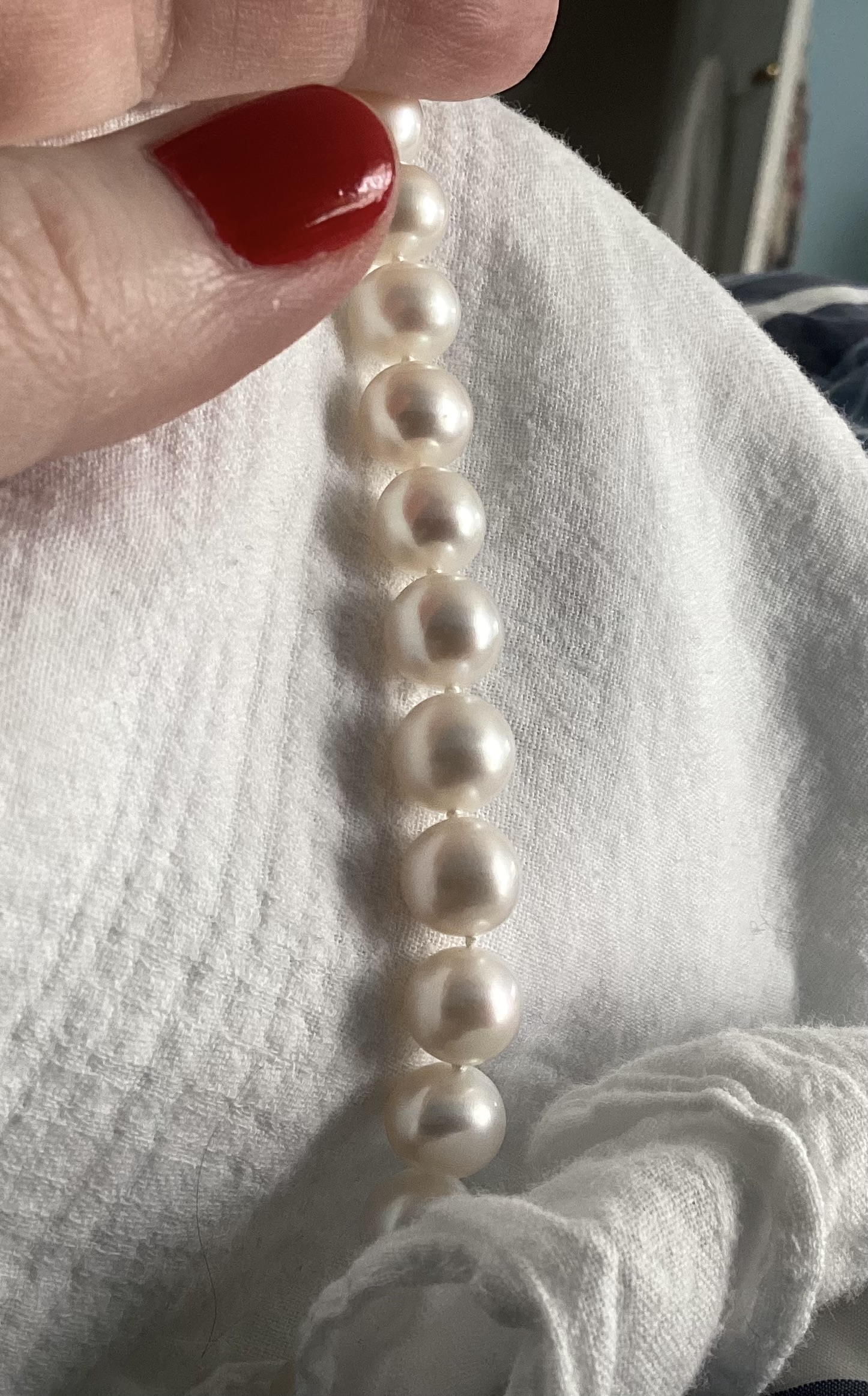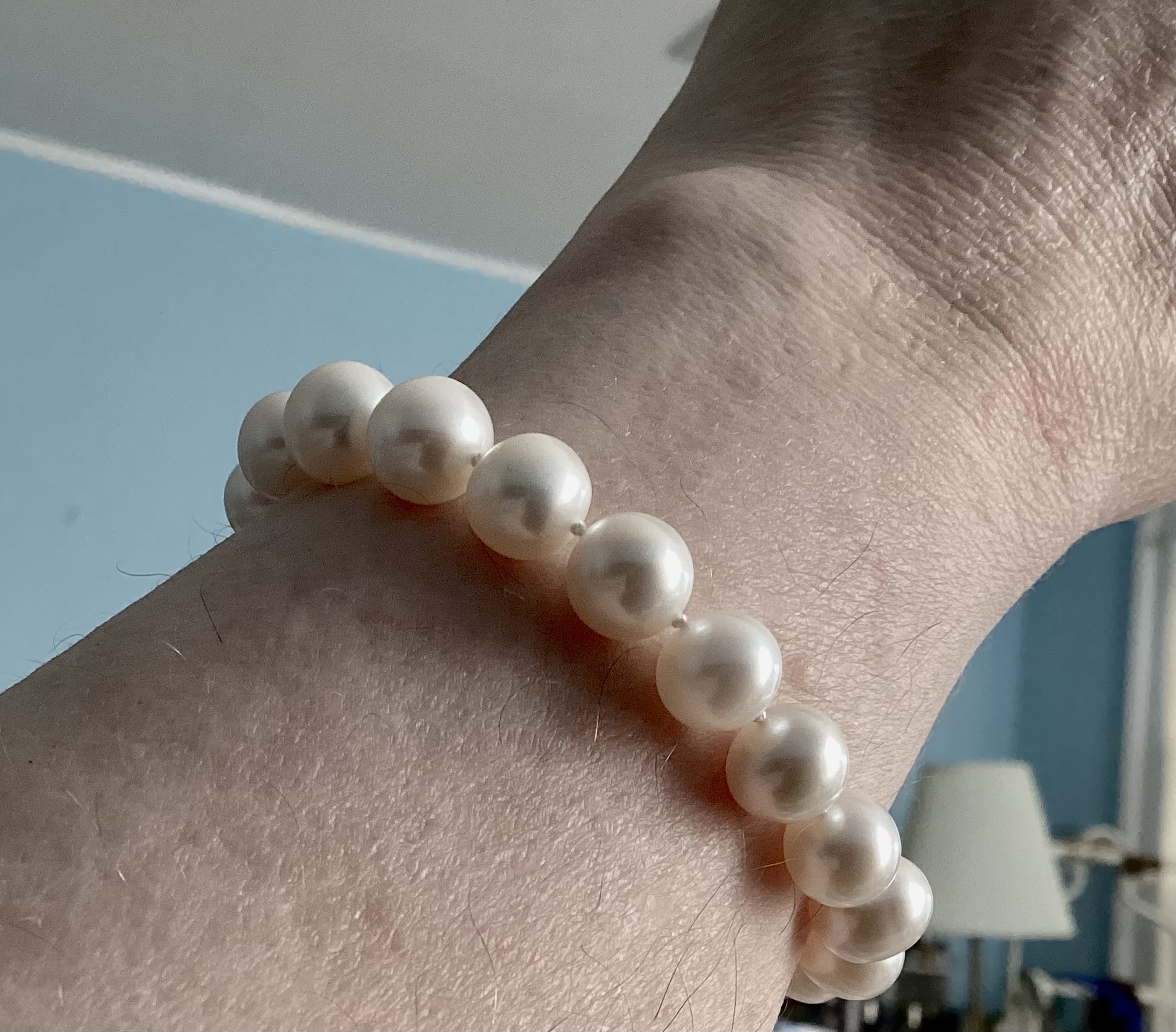 I got these not long ago, and as usual I’m very happy with a PP piece. They were listed as 8.5mm to 9mm but all are 9mm so to me they seem very grand! They’re AA+ but plenty round enough for me. The lustre is more satiny than sharp, which is a white freshwater effect I love. We haven’t had much sunlight here for pearl pics so I may retake these. My taste is kind of sedate, I suppose. I still have loose Tahitians and white SSP to create with later this spring, so those may be jazzier! Thanks for looking!
