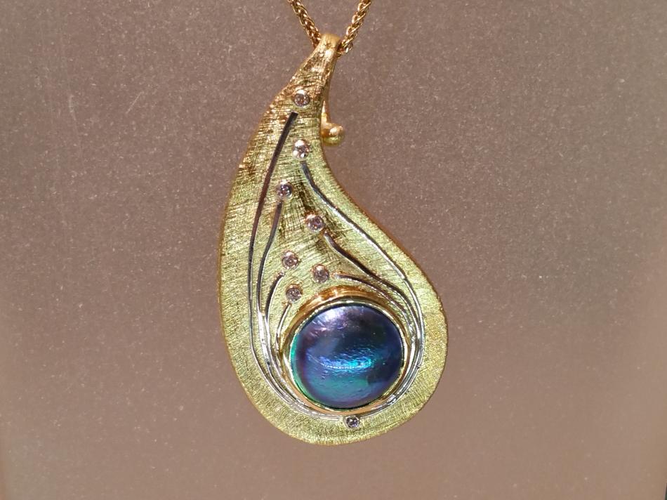 Alishan Halebian is an asthetic master and it shows in these fabulous designs. First is a luscious pendant with texture and diamonds--perfect for setting off a radiant blue abalone pearl.