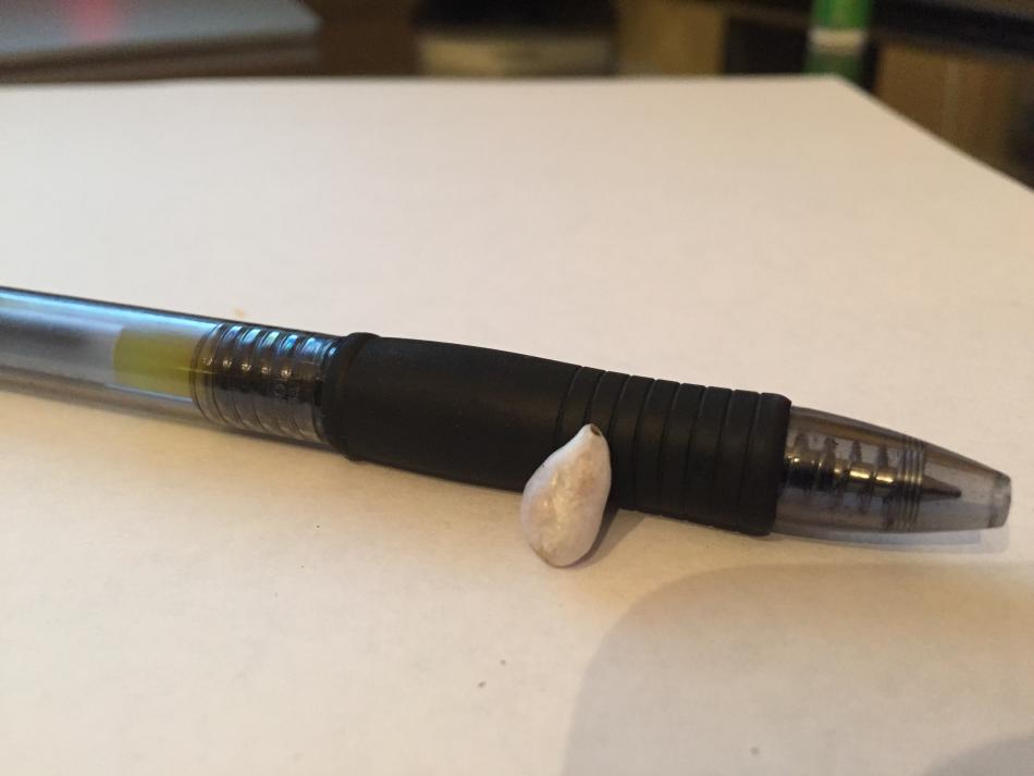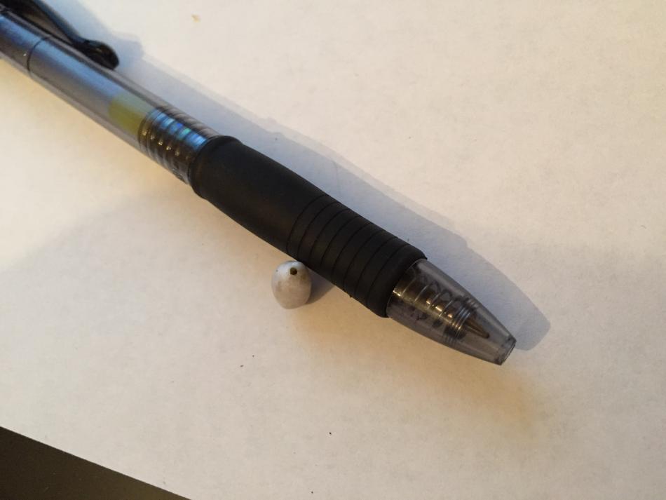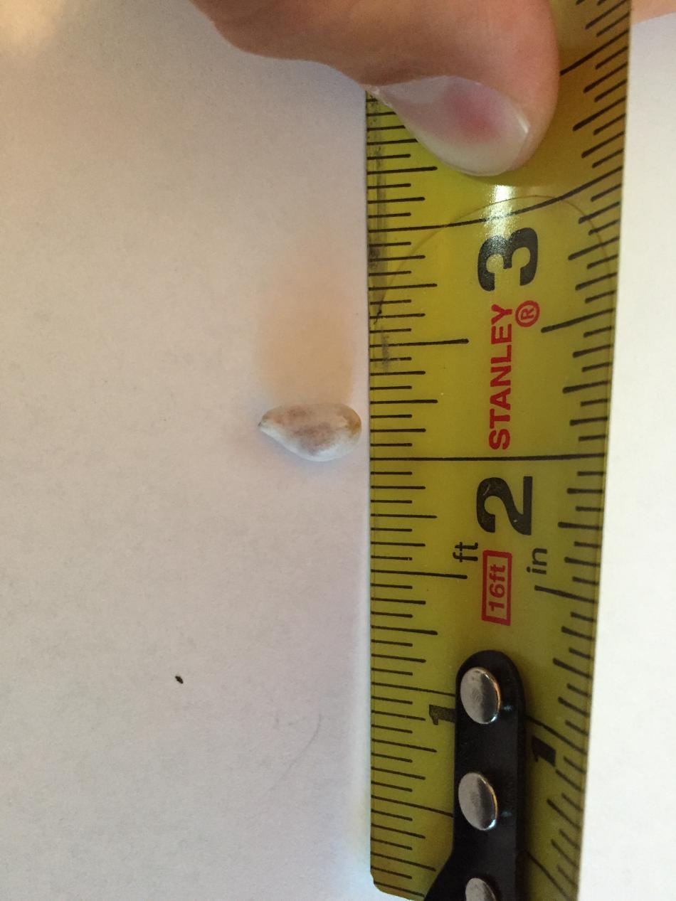 Pics attached - You can see that it is teardrop shaped, mainly white with some dark spots (blemishes) on it. They are sort of a purplish/pink color. There is a black spot on the top.