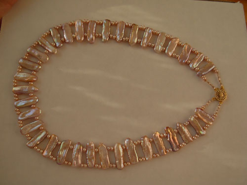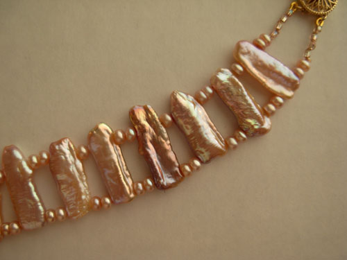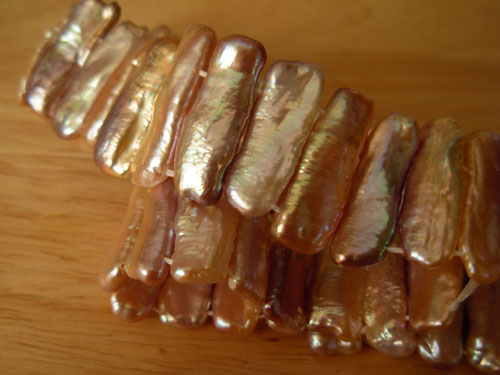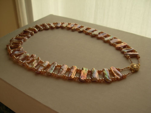 As I was making it, the colors shimmering in the incandescent light made me swoon. Here you can see the gleaming surface in a side view, but at night, you could literally see right into the pearls.