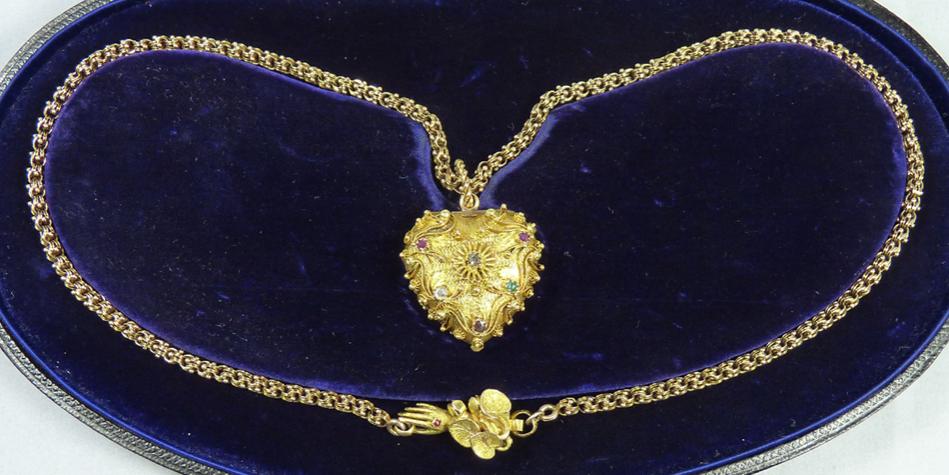 These lockets were even fit for a queen, as we see in the following portrait by Herbert Smith of the young Queen Victoria in the year of her wedding (1840), proudly displaying her gold locket necklace.