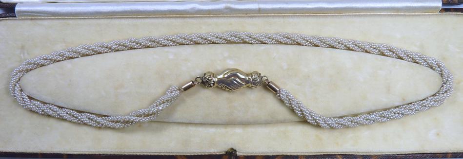 The seed pearls in the necklace below are just 1mm, drilled by hand. Three strands are woven into a string, with three strings then woven together as the necklace rope. The gold clasp depicts two clasped hands, known as a "fede", from the Italian "Mani in Fede", meaning "hands (clasped) in trust".