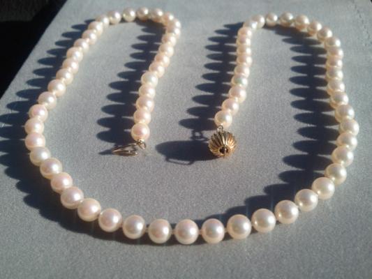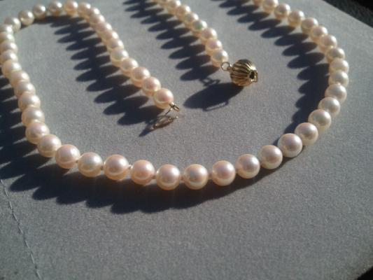 AZ Oyster, you're ahead of the game in that you know they're cultured pearls. It looks like a nice strand of small pearls (5.5 mm), in a popular length, with a standard design clasp. Unless they're from a desirable maker, necklaces like this are selling for less than $200 on eBay.