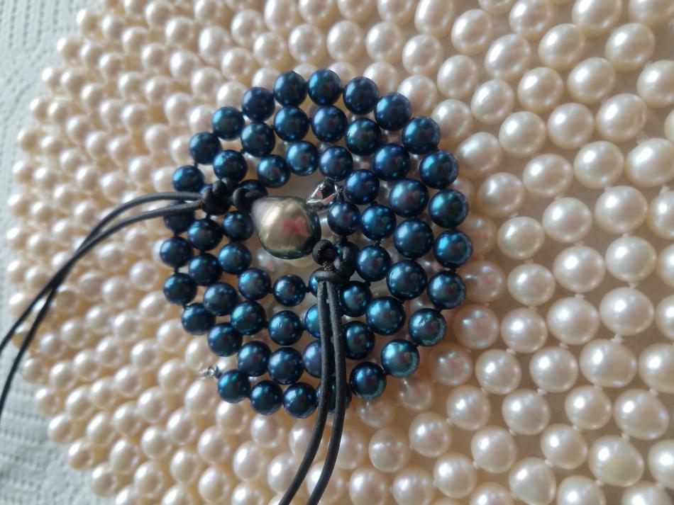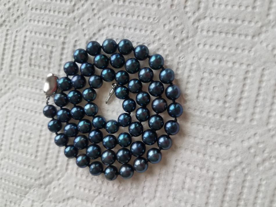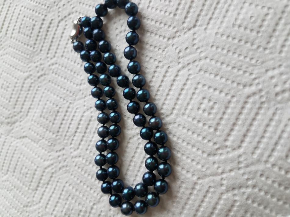 Measures about 18 inches, pearls are smallish and uniformly sized, about 5-6 mm. The shapes seem to my eye to be perfectly spherical, though a few display rather large blemishes that detract from the round appearance of the individual pearl. Body color is pretty much consistently jet black, and the overtones range from deep green to deep blue. The luster on these is also quite different from my freshwater rope and my single Tahitian. It seems to have a harder, sharper, perhaps even more "liquid" quality than my other pearl pieces. I would just love to know more certainly what kind of pearls these are.