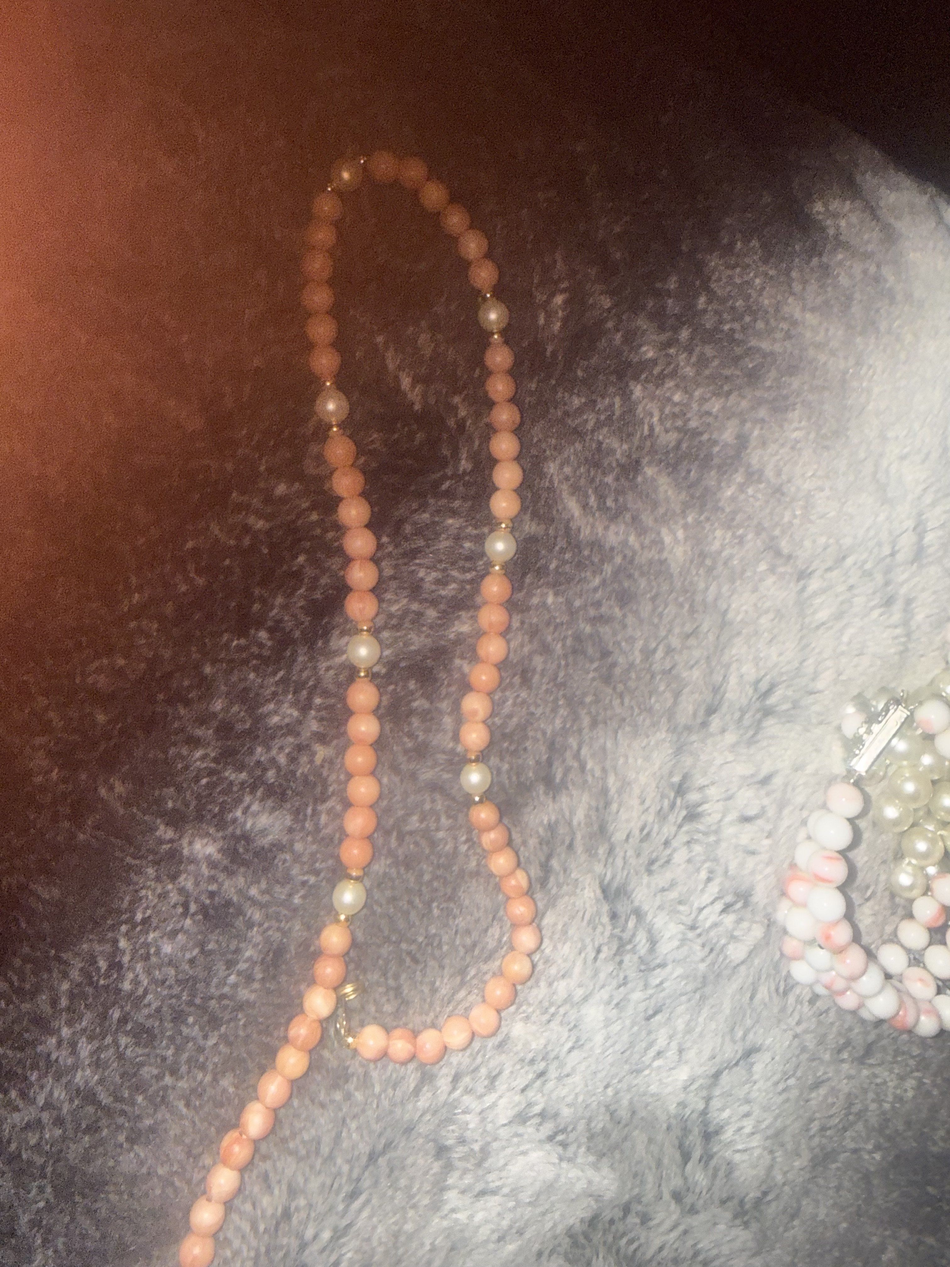 I'm no expert, either. I believe the strand with the pearl stations could be coral or maybe conch shell. Conch shell is often used in jewelry for cameos and beads.