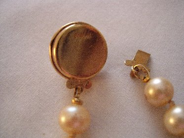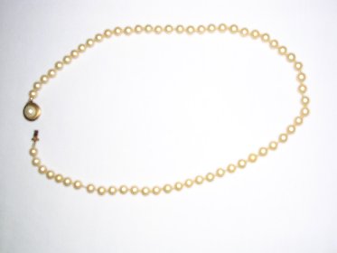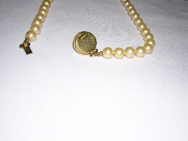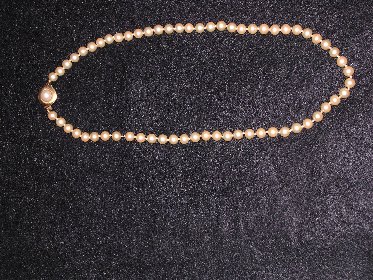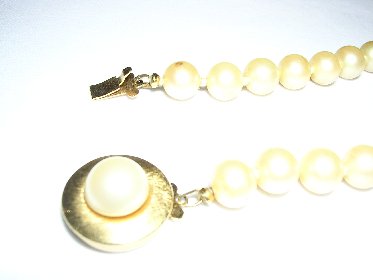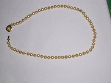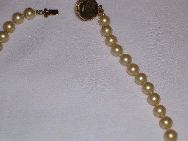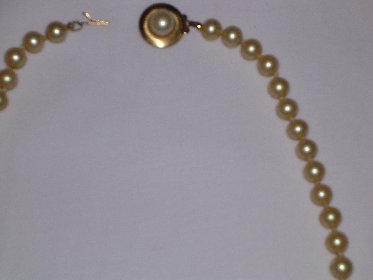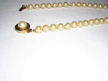 Here are a couple of pictures of a pearl necklace my sister inherited from her mother-in-law. She didn't think they were worth anything so she gave them to my mother who is 89 years old and has dementia. I think they may be real and if they are, I certainly don't want my mother to "lose" them. They have a slightly yellow cast, and are gritty when I do the "tooth test". They are threaded on what looks like silk thread and there are knots between each pearl. The clasp is gold with a pearl on the front, and on the back of the clasp there is something engraved. I think it is 42228. I'm not sure because it's very small.