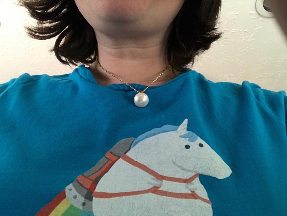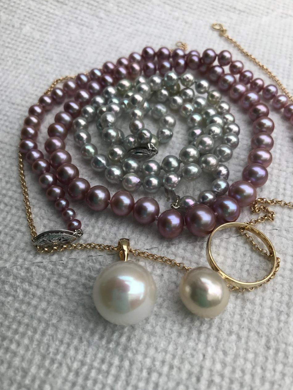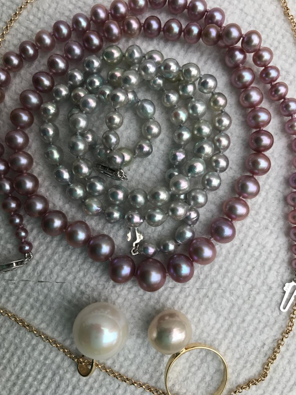 This morning, when I arrived at work, I realized that (because I had dressed in the dark) I had accidentally grabbed my lavender graduated strand instead of my green Vietnamese akoyas. On a teal-green and black dress. Lavender on teal-green: NOT a good look. So I was bummed out.