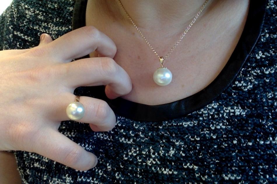 I bought it partly to pair with this 11mm Edison ring I already had. I love how the yellow golds are playing backup for the nice bit of orient in both pearls. Not a terrible match!