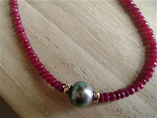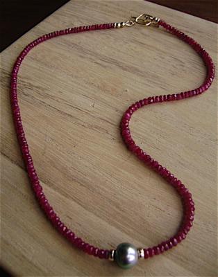 I've been lurking, and now I am a new and much more educated member. Wow! So many things to learn about and fall in love with. I am on the Big Island of Hawaii and have had Tahitian students and therefore pearls around for a while, but now I am actively seeking them, as well as some of the other amazing pearls I've discovered through this site. Right now I am incorporating them into necklace designs, but I see full strands on the horizon. Already got some of Josh's through Druzydesigns, and am lusting over more. Here are 2 necklaces I made with the Kamoka pearls. The one with the black diamonds literally sold right off my neck the day I wore it in public to the local farmer's market. The other one I just finished. It (the ruby) has a pearl that looks half blue/silver and half darker green tones, and all kinds of other colors. Trying to figure out the photography. Very excited to join and hope to keep my shirt over the next few months!