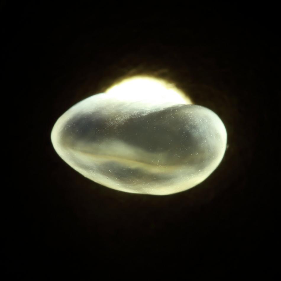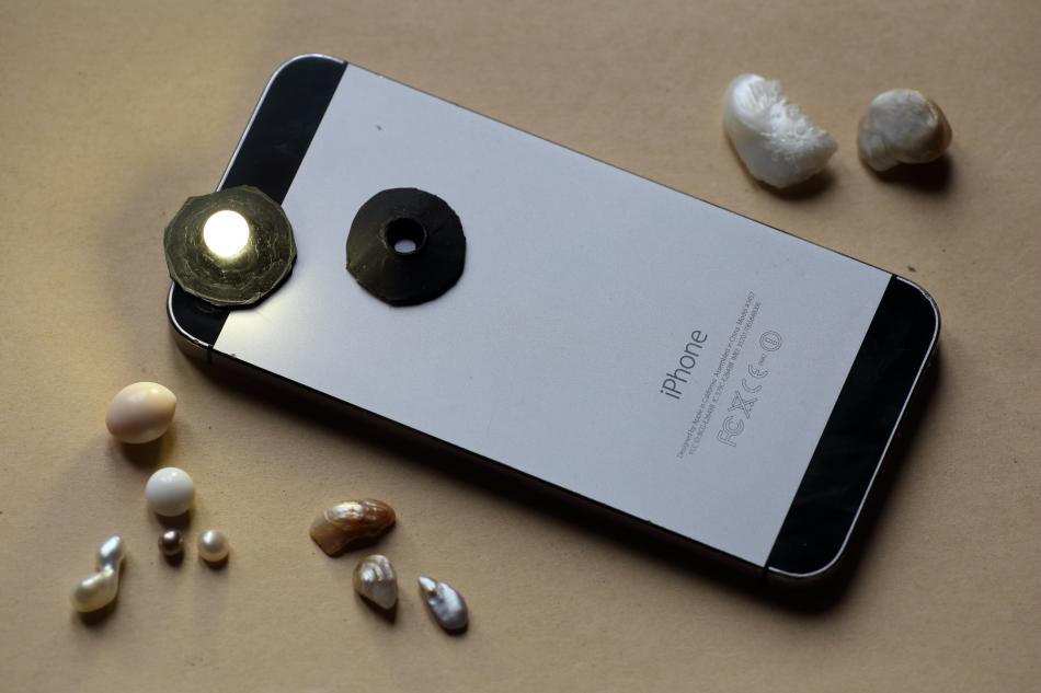 I think the best would be a black thick plastic or strong material with hole, and extra black colored putty, for a bog good contrast, then, use a spotlight with variable power, use small power to display the pearl with best angle, then fix the putty to fill all the gap, no light on sides or so, and then full power for the picture, it would help to use a better setting on camera too, quicker shot, making better details.