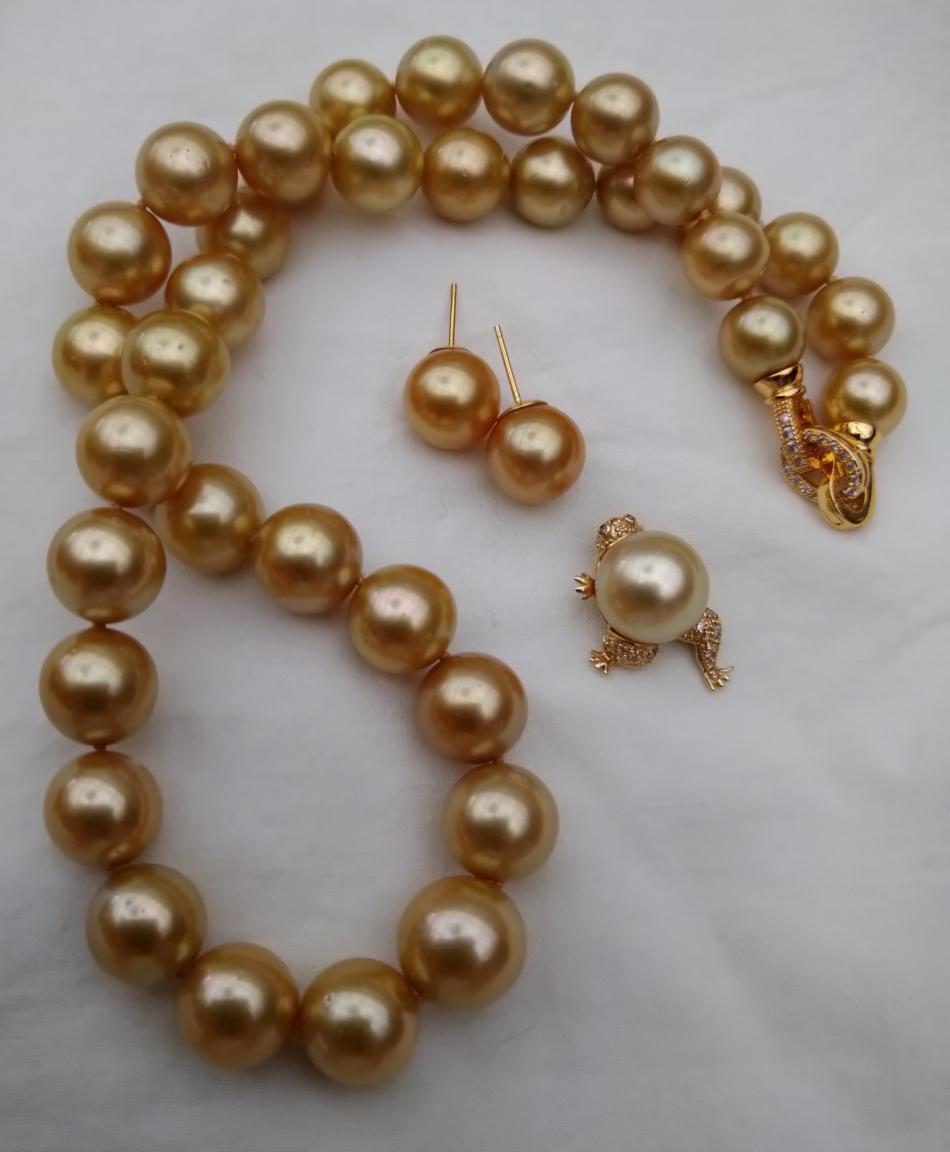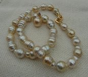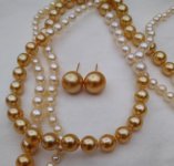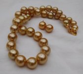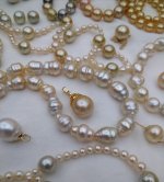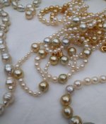 This discussion of colors of GSS is interesting. In the ropes of very special GSS at the Ruckus a few years back, there was a clearly range of colors, including some silver-blue keshi. Unfortunately, I wasn't able to purchase any of them. I do have a strand of GSS which was from Druzy Design back about 2004. I also got a strand if GSS keshi which I added to lengthen my necklace and make a bracelet. I'd say the color of my pearls is 14K, but your deep color pearls with their overtones are beyond 22K or even 24K.