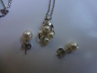 In the pictures, the earrings are unrelated; I bought them yesterday in order to compose a gift set. They are 6 mm and absolutely Fresh Water. The chain and pendant body are sterling silver. The brand is Mikado Pearls, in Japan, but nothing is to be found on this company....