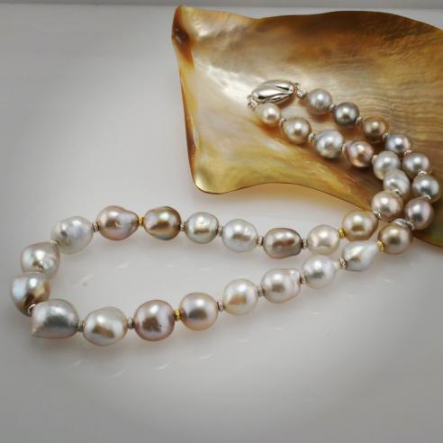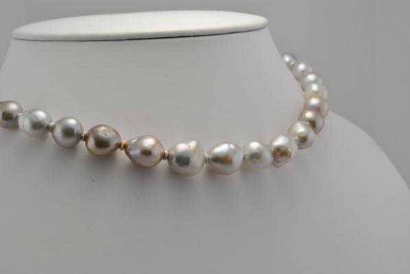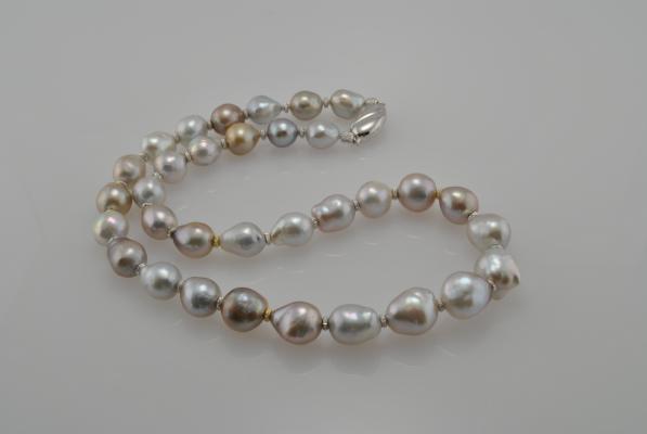 I recently came by a strand of cultured pearls from the Pteria penguin shell. I found them in the far back of a suppliers show case and was immediately drawn to them because they were obviously ocean pearls but the colors were unlike any I had seen before.. Some golden mauve/brown tones mixed with white and soft silvers. This shell is NOT easy to culture pearls in and is normally only used for mabe production. As it was explained to me.. They represent years of trial and error by a single man in Indonesia and this one strand represents thousands of tries. They are not large pearls (9-11mm). They have soft baroque shapes and great surface and luster through out.