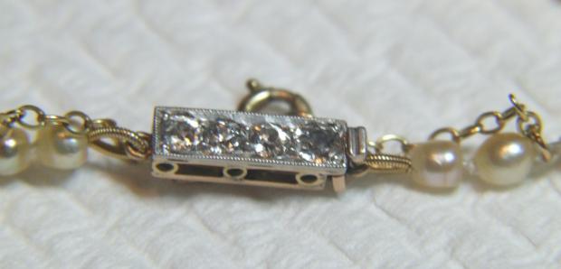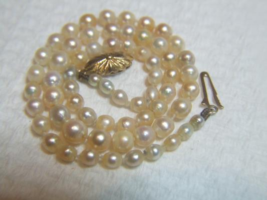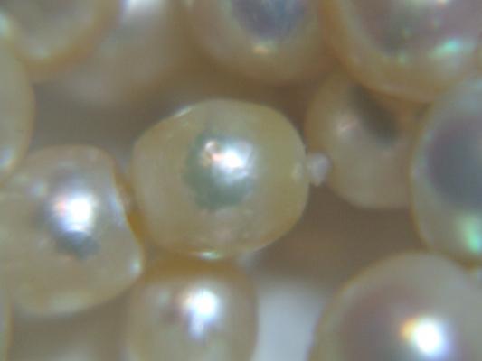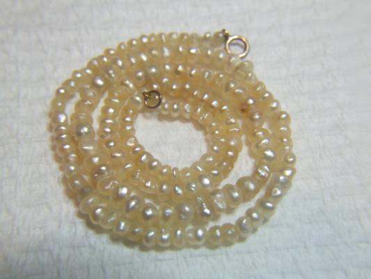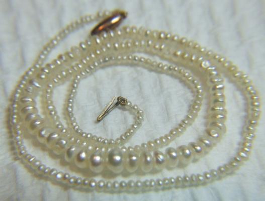 I just looked at the photos again and remembered that the longest necklace had at least 7mm pearls in front so the smaller necklace must have at least an 8mm pearl in the centre. None were tiny seed pearls and all a good size. I remember I didn't really want to put such a large pearl in the centre and had to go through every pearl I had to find a suitable one. It had to be good enough to stand out like that. No blending in when in the middle and surrounded by gold.