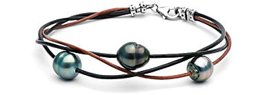 I've seen more men wearing pearls on TV recently. The CEO of Diamond ResortS in the show "Undercover Boss" wears a leather Tahitian bracelet. The pearl is quite large at about 15mm. Steven Tyler of American Idol wears multiple leather Tahitian necklaces on the show.