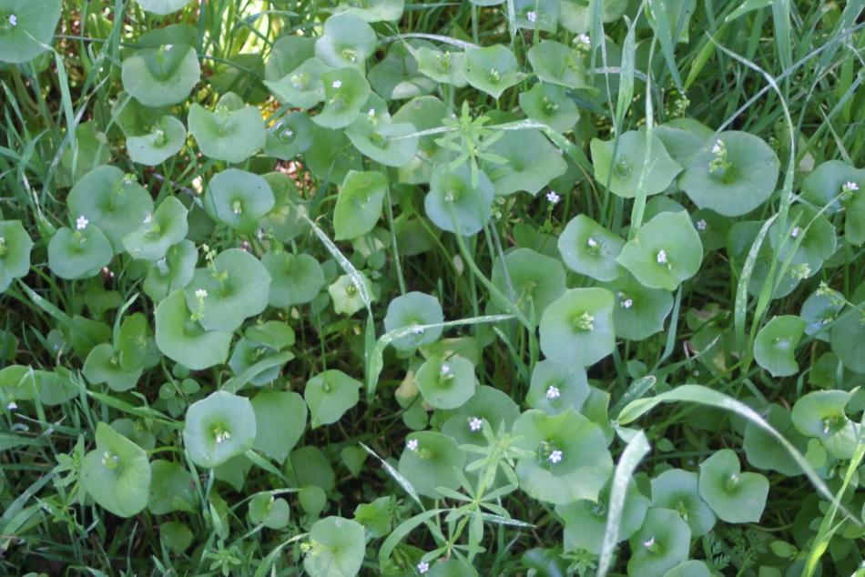 It's called Claytonia perfoliata, also sometimes called Winter Purslane or Miner's Lettuce. :D
