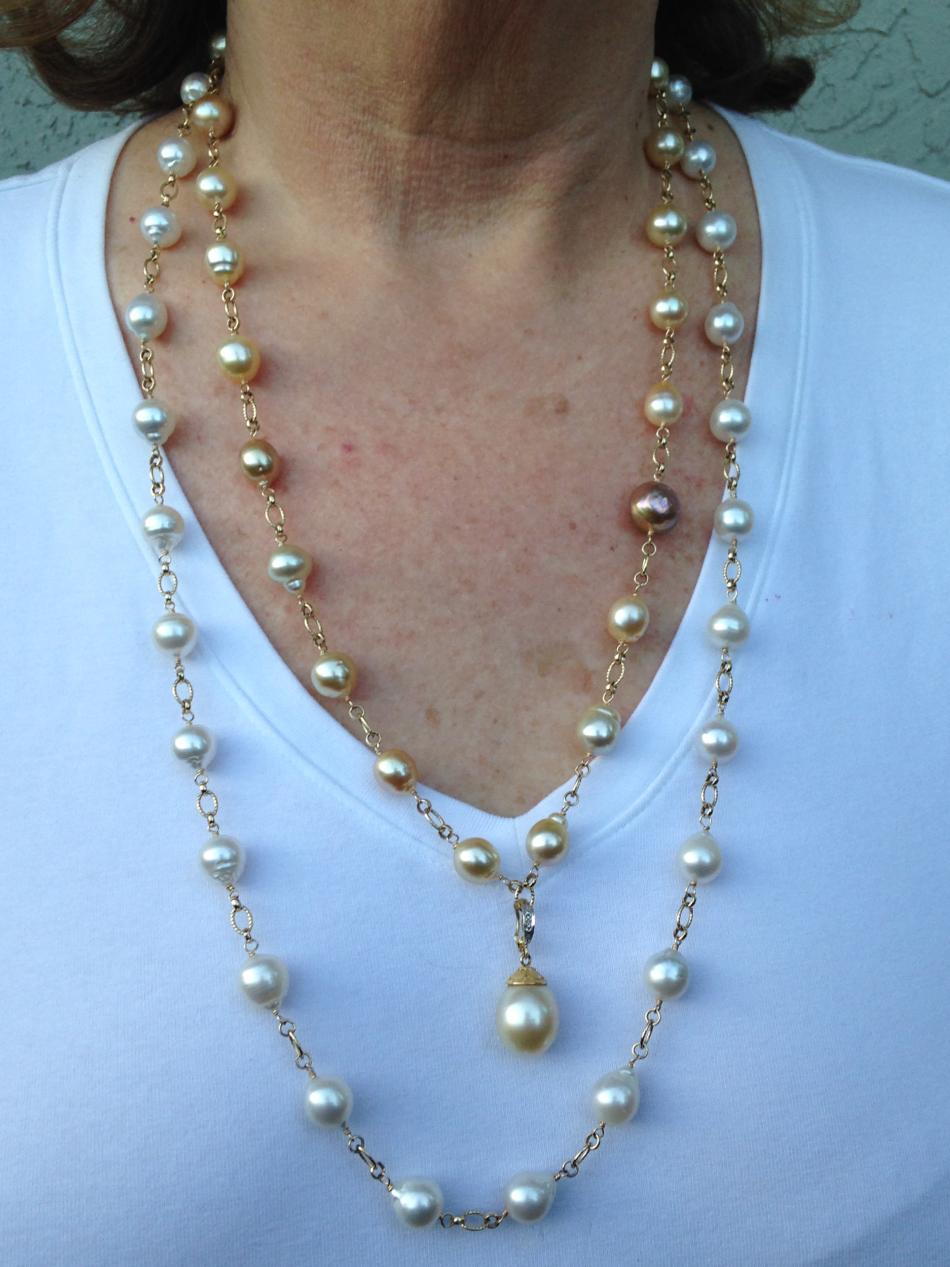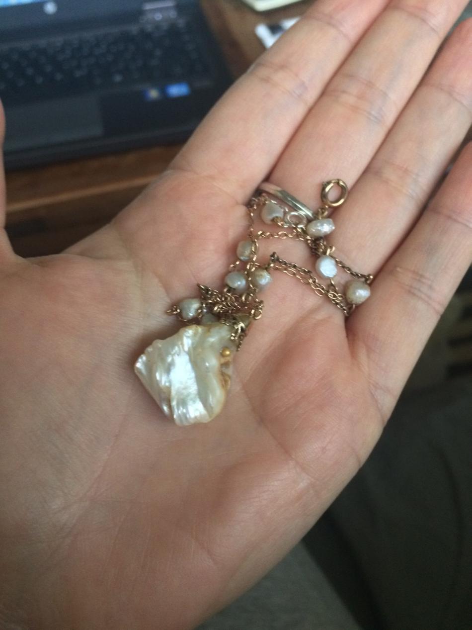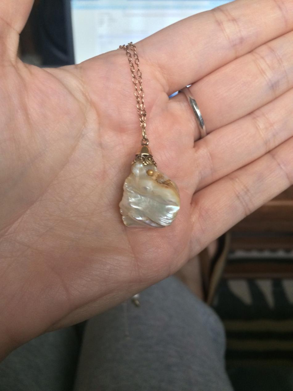 Thank you, BWeaves, Jersey, Lary, and Sanippy!! It's an Edwardian or perhaps Victorian necklace, the pendant features a large blister pearl and the neck chain is studded with pearls in a tincup fashion. All American river pearls. Someone had drilled a hole through the blister pearl, then I guess decided Nahhhhh and instead put a gold cap on it. So strange. When I purchased it, it had the large hole showing, so I got it for a steal. But the hole always bugged me, so this year I picked up one of those gold and diamond plug things from Gempacked for the smooth side and made a ball head for the wrinkly side and glued them in with 2-part epoxy. Looks seriously better!