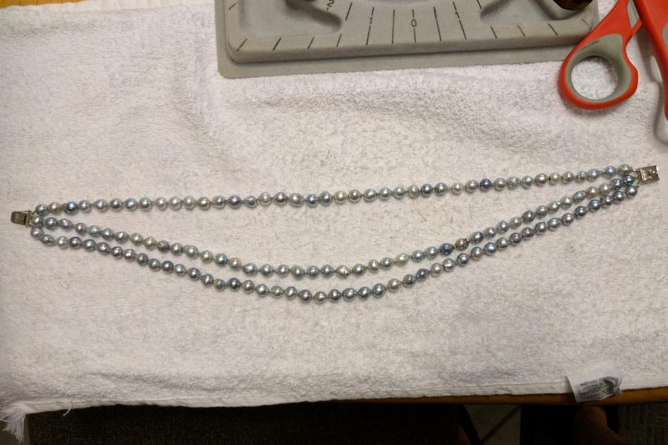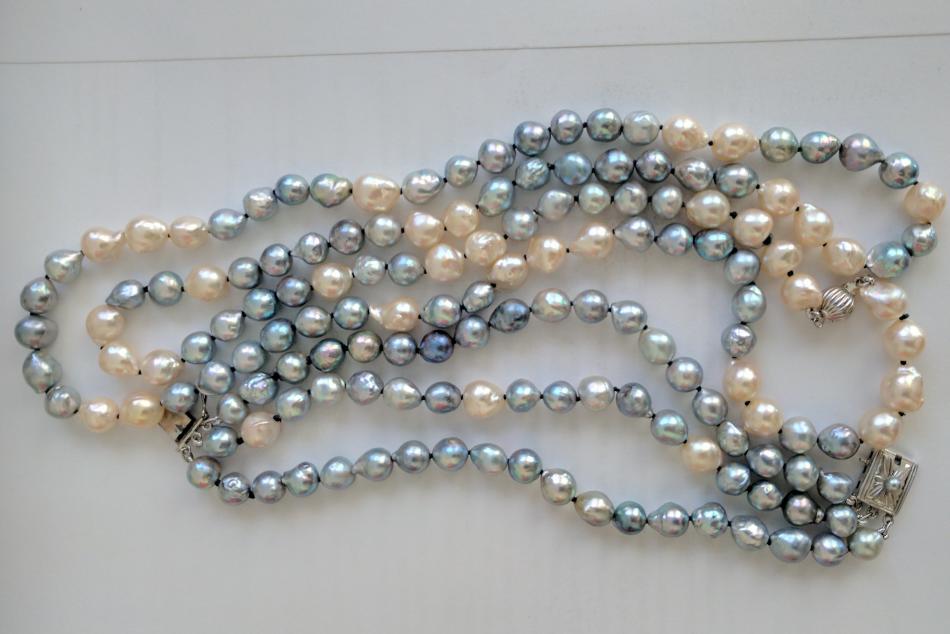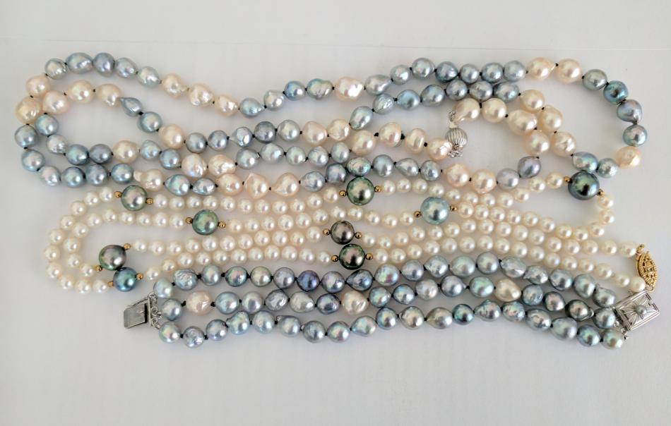 I remade a necklace using a vintage blue baroque akoya triple strand that did not lay right. I used the original clasp for a bracelet and added some vintage baroque akoyas to add length. When I had the bracelet laid out, I had two blues on one end and three on the other, so I'm not quite sure how I ended up with one and four. I'll rework it at a later date. I wore the new strand today with my round akoya and Tahitian strand when I visited my mom. She hinted that she wanted the strand, but being the loving daughter I am, I gave her another strand and brought this one home with me. :D