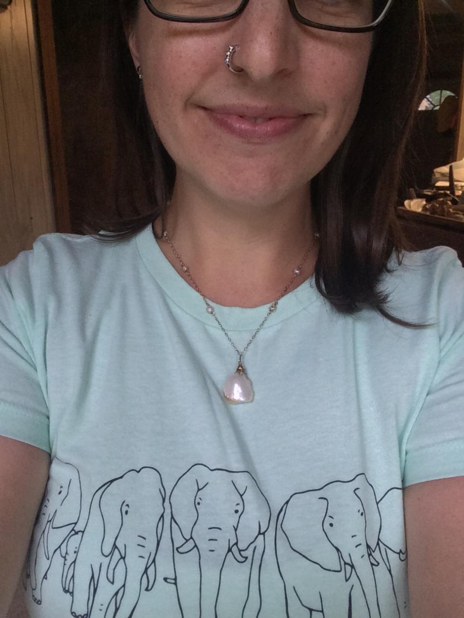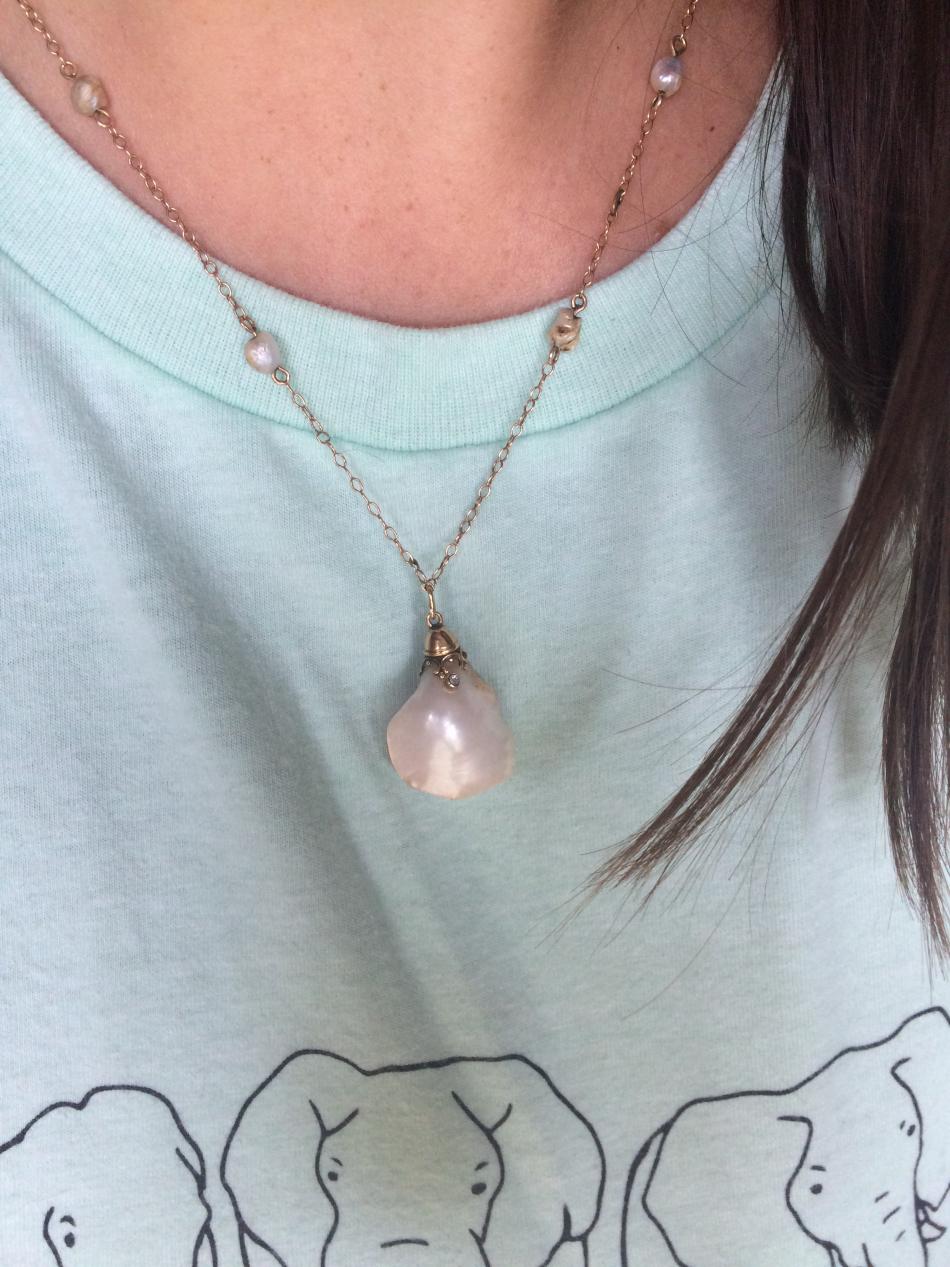 I went to a very casual lunch baby shower for a local friend, so I wore a t-shirt and a large American river pearl.