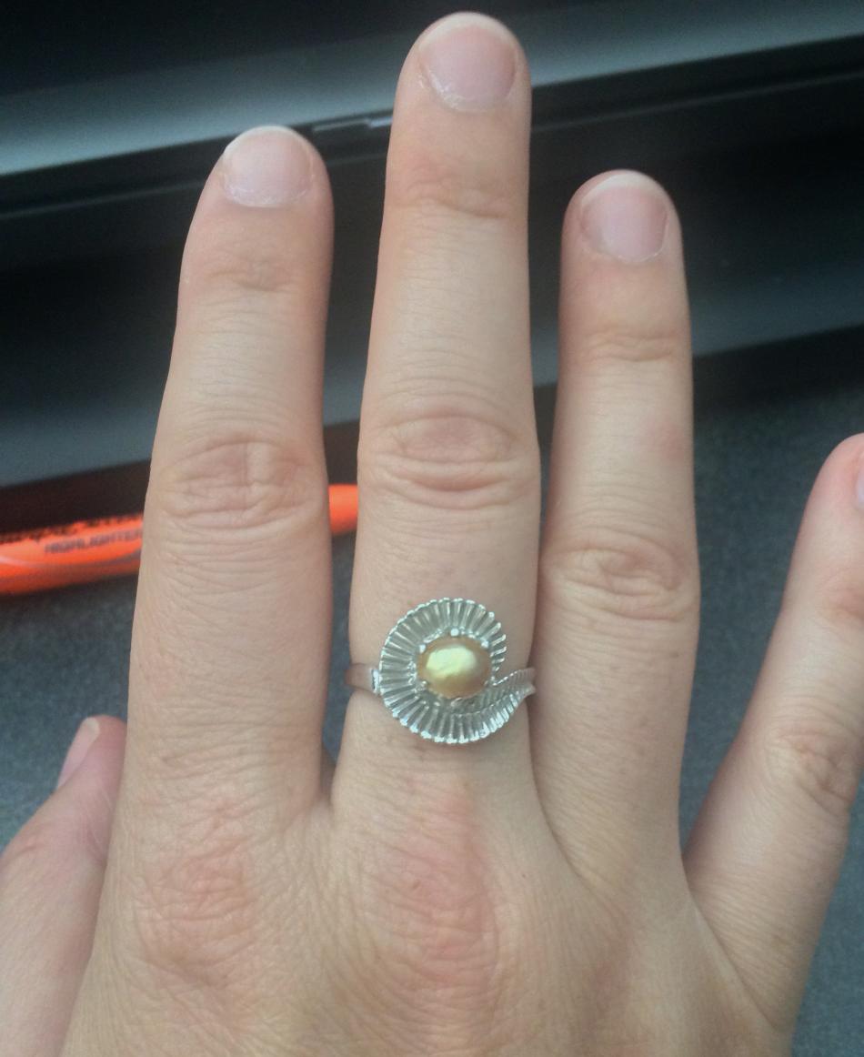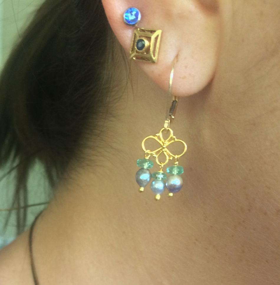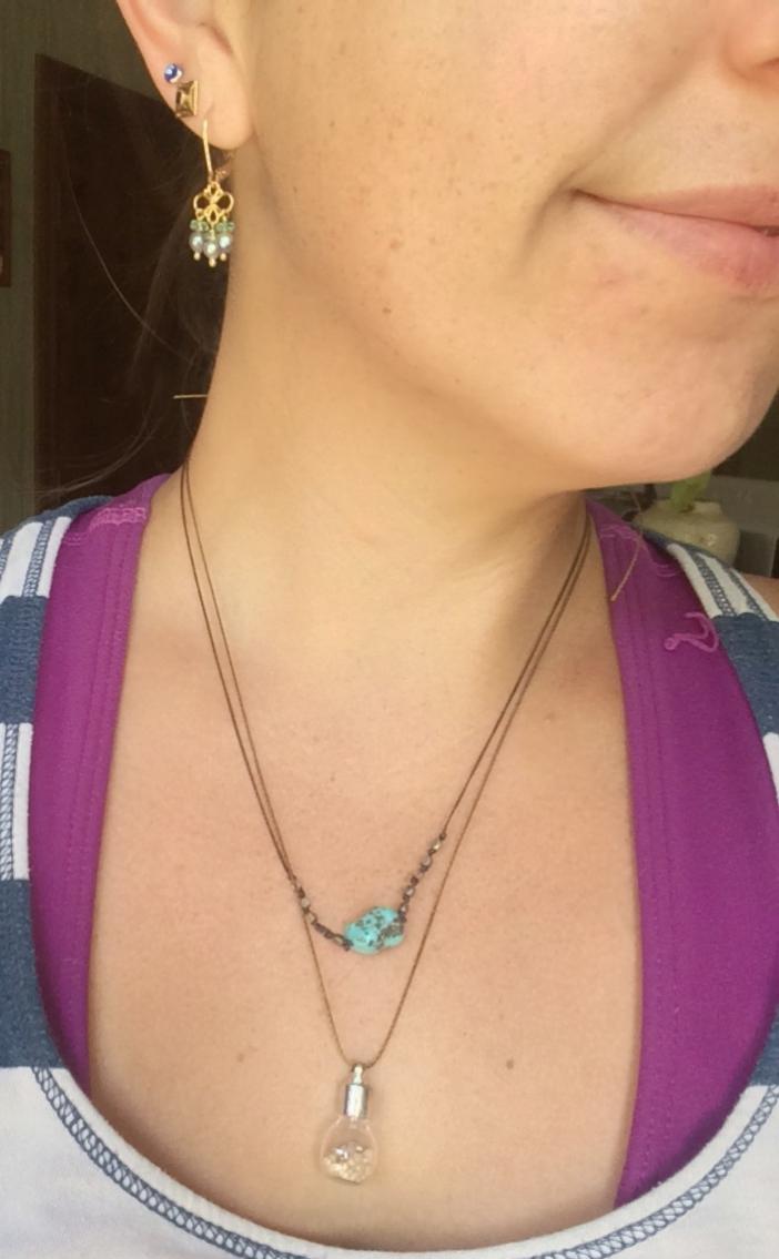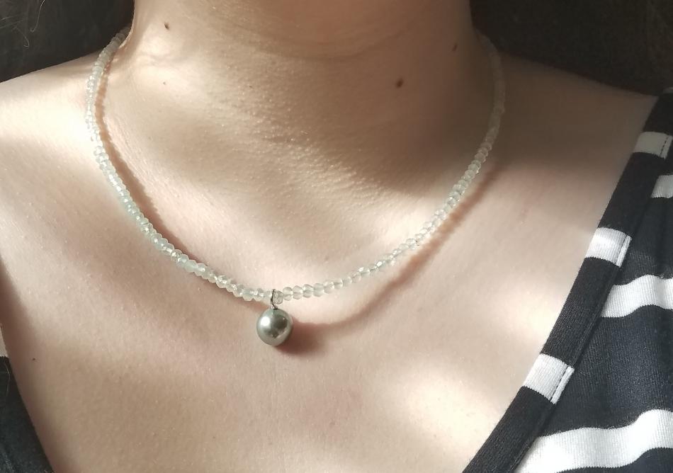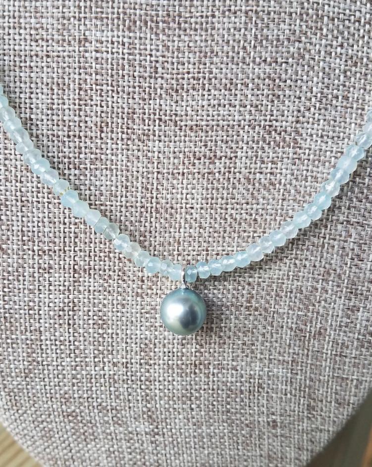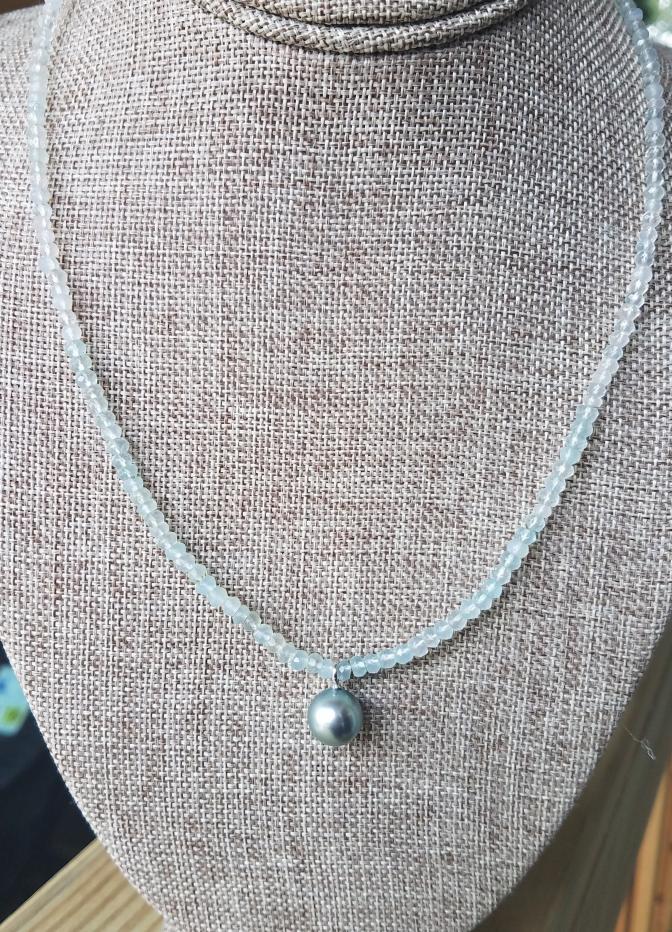 It's a 10mm silver blue Tahitian that I got from Jacques ages ago and just didn't know quite what I wanted to do with it until I saw that listing. The rondelles I used are 3-4mm sea foam chalcedony. The picture of it on me looks really washed out..the necklace is much more like the pictures of it on the bust.