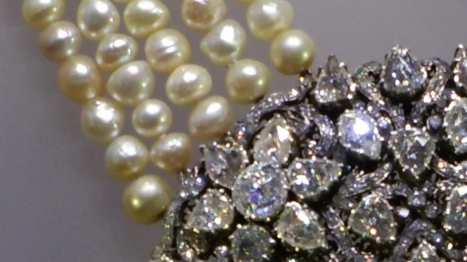 According to GIA, "This exotic necklace features an 18K gold and silver pendant which has 58.72 carats of rose cut diamonds. The strands and tassels are Basra pearls...