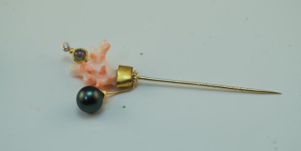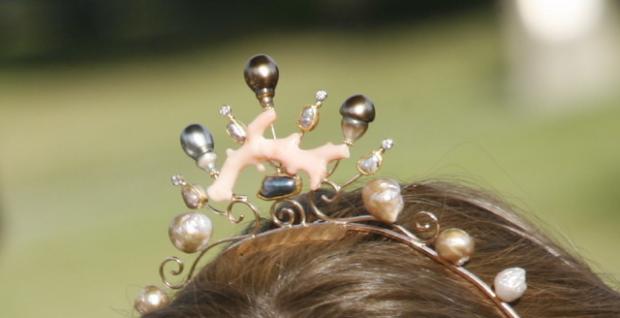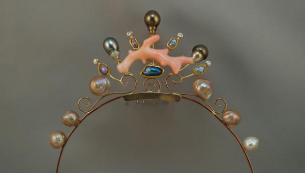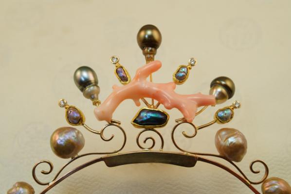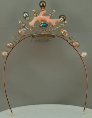 The body of the tiara is 14k rose gold, with 18k yellow gold bezels and 22k yellow gold accents. There are baroque Kamoka pearls, natural wild abalone pearls and Japan Kasumi pearls, "angel skin" coral and a few little diamonds for sparkle. It is a truly magical piece of jewelry. There is also a lapel pin to match (for the groom)!