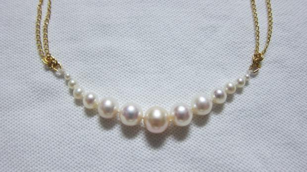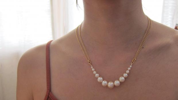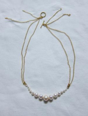 This is a graduated pearl and chain necklace I put together using some pretty freshwater pearls from RainbowIslandPearls on ebay, ranging from 3mm to 10mm. Inger was really kind and went out of her way to help expand this set of pearls from original earring sets (five pairs of matching pearls) into a bracelet/necklace arrangement with a center pearl. She even sent me some extras to give me more options!