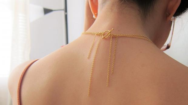 I still have to order french wire and adjust my knotting (Pattye's Beaders Secret thread) so that the knots aren't so exposed at the end, as well as making slight adjustments to the jump ring placement at the toggle. I left the extra chain at the back in an asymmetrical format because I thought they would create interest at the nape of the neck, but they tangle easily and need to be adjusted to lay properly.