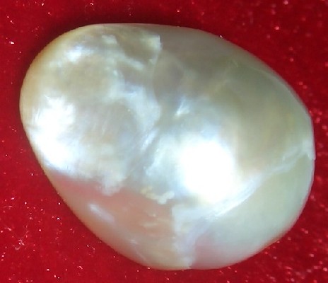 The one that is translucent is not a gem because of the shape, though it is walnut sized! Too much translucency on one side is no halo, but by tilting it this and thataway, you can see these iridescent sheets running to the edge. If it were much rounder, the water would be much more attractive. Tom's pearl has a a bling factor around the edges as you move it. It flashes on and off as you turn it..
