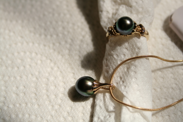 They were purchased at different times, although, it's the same designer: Steven Lee of Hawaii. I love the settings of the ring and pendant too. The ring and pendant are from Grande's Gems & Gallery on the island of Kauai, Hawaii. Earrings ...I don't remember which store. The ring is 8.2mm on 14K setting and the floral part near the ring is 18K with 8 diamonds totaling a teeny .05 cttw. The drop pendant is 9.2mm on snake chain. He makes the matching dangle earrings too, but the gold setting was too long for me. So I settled for the ribbon swirl earrings, 9 mm round. The PG vendors' prices are much more attractive. I haggled on prices a little bit. I don't think I did too bad on the ring and pendant, but I really got ripped off on the earrings. Don't even ask me more about prices, I am sooooo embarassed.