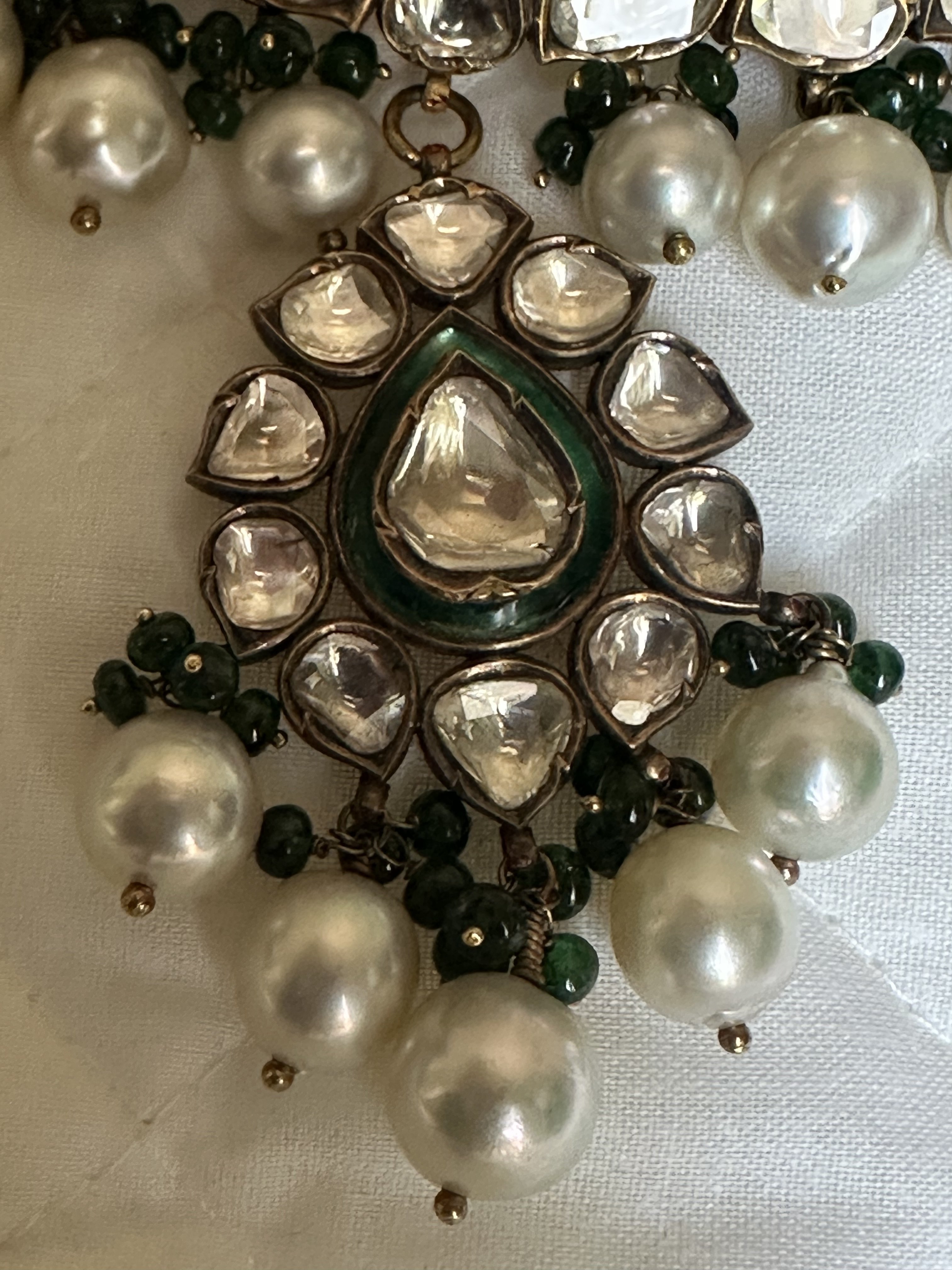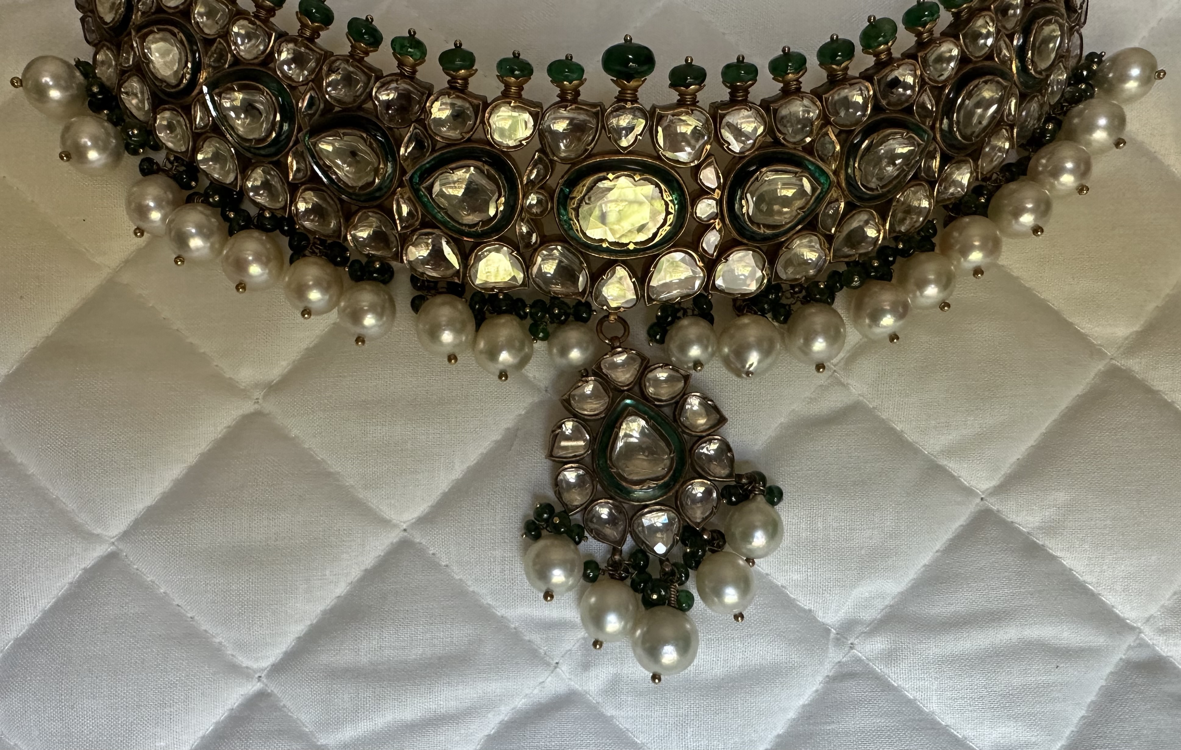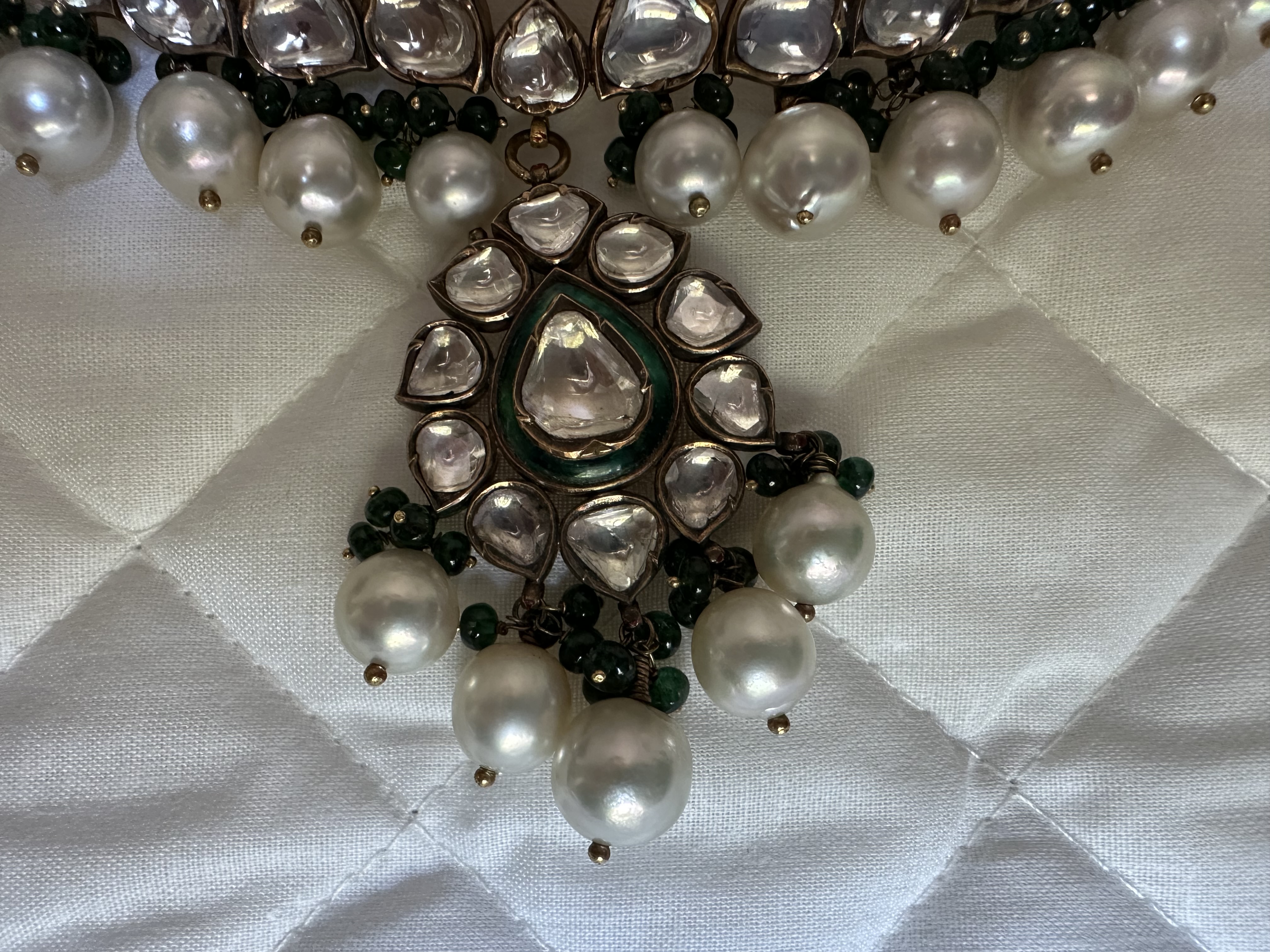 I need help in identifying the pearls used in this necklace. They are around 9.5 - 10 mm in size and on an average 5.5 carats each in weight. While some of them may appear round in the pics, they are actually oval shaped. Even though the main feature of this jewelry item is the uncut diamonds, I found the pearls very striking, hence the question.