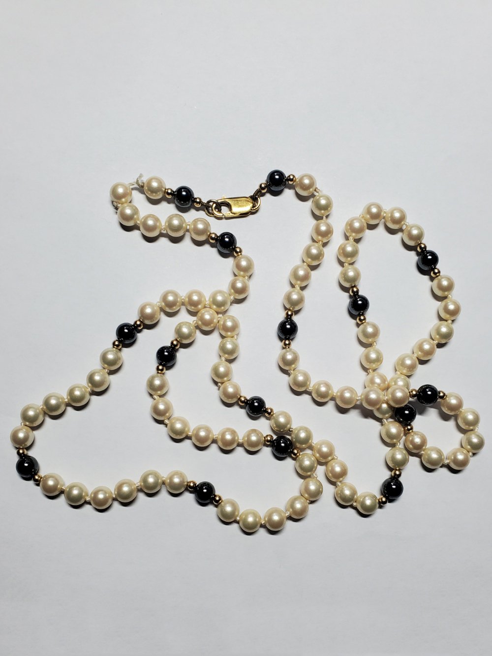 I'm hoping someone here can help me identify these pearls. Each one measures about 6.6 mm, and when I hold them up to the light, I can see darker lines running through the inside. There’s also a mark on the clasp, but it’s very small, and I’m having trouble reading it. I’ve attached the best photos I could take and I hope they’re clear enough to be useful.