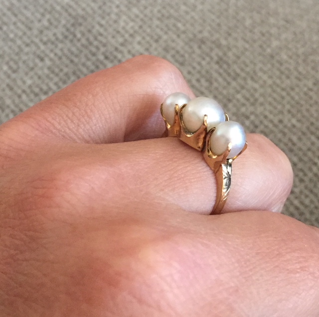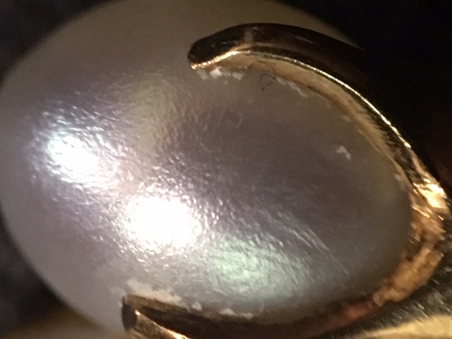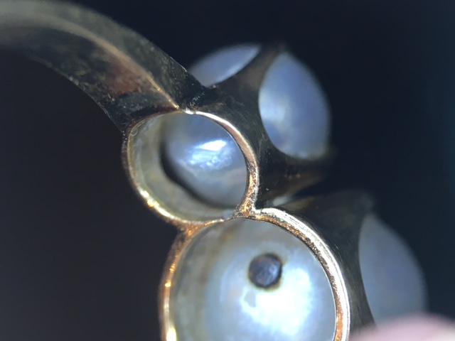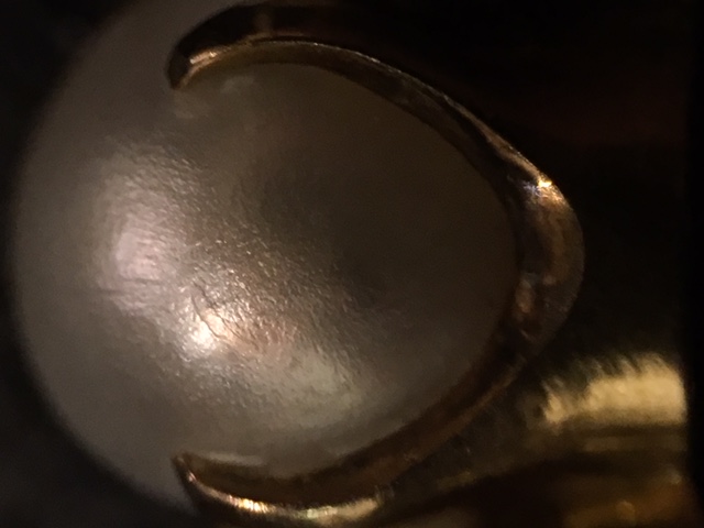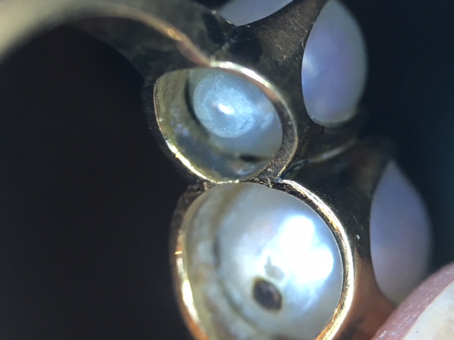 The Pearls are rather bulbous in their setting and the two end ones are pear shaped with the more pointy end inside the setting. The centre is more bouton and has a metal sprue where it has been mounted before. They have a bubbly surface like the moon, which shows in the photos. One of the end ones seems to have a smoother core which could be a MOP centre (last pic) which surely would be strange as these should be tissue nucleated?