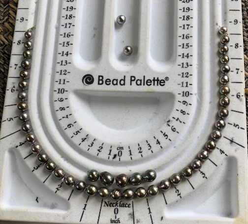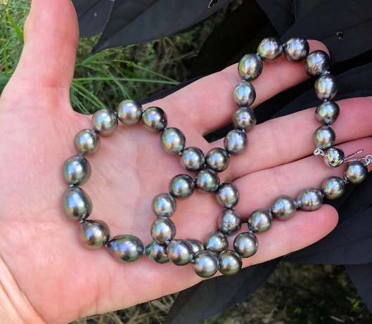 I bought a pre-loved baroque Tahitian strand ( AA+ quality strand 8-10 mm) and became obsessed with the color. What I wanted to do was replace the most blemished pearls which were at the very front of the necklace. The color is a light silvery peacock. After a few months I collected enough pearls and finished the strand which now is 8-13mm. There are still 2 more pearls I want to replace- but now I find the strand very wearable.