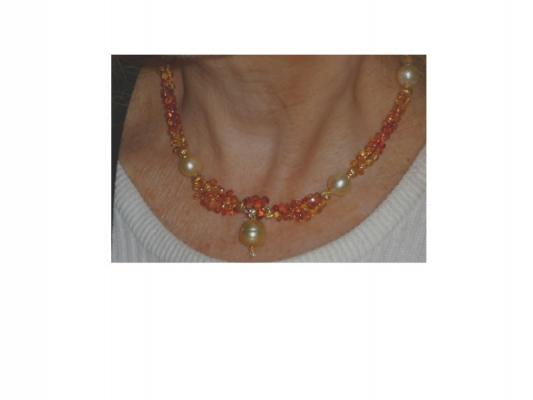 In the necklace the wire has to go through any sapphire bead once, but both wires have to pass through each of the four side pearls, and one of the wires has to pass through the diamond bead holes once and the central pearl twice. In this necklace the .010 wire, which I could obtain only in 19 or 21 strands, was used to pass through the diamond and the central drop pearl.