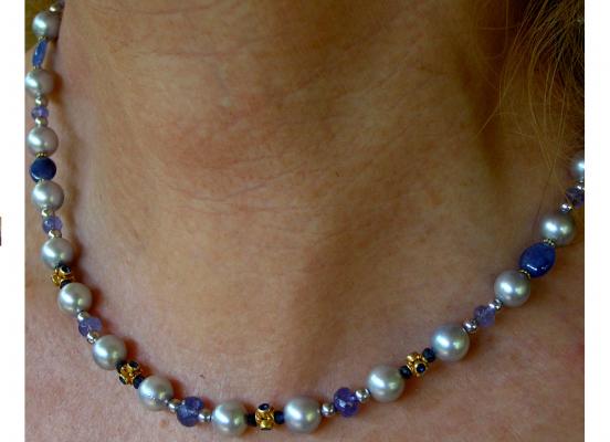 As a preface I will give you a simple rule of thumb for calculating the number of sapphires that you need to make the “chain” that you see connecting the two upper pearls on each side, and then connecting the end pearls to the gold beads that lead to the clasp. You will need 24-26 per inch (12-13 on each parallel strand). The “chain between the pearls is about 2 inches in length.
