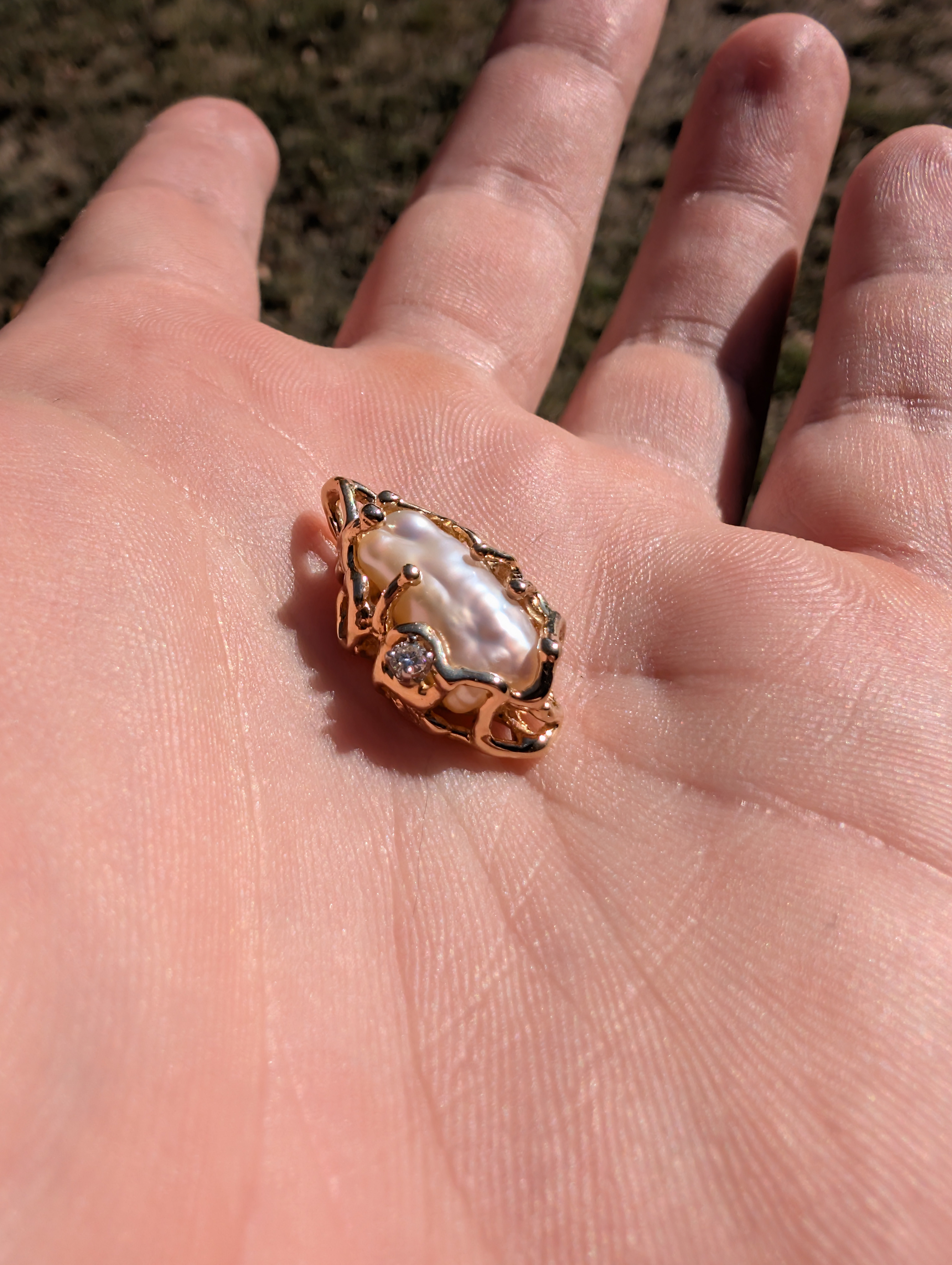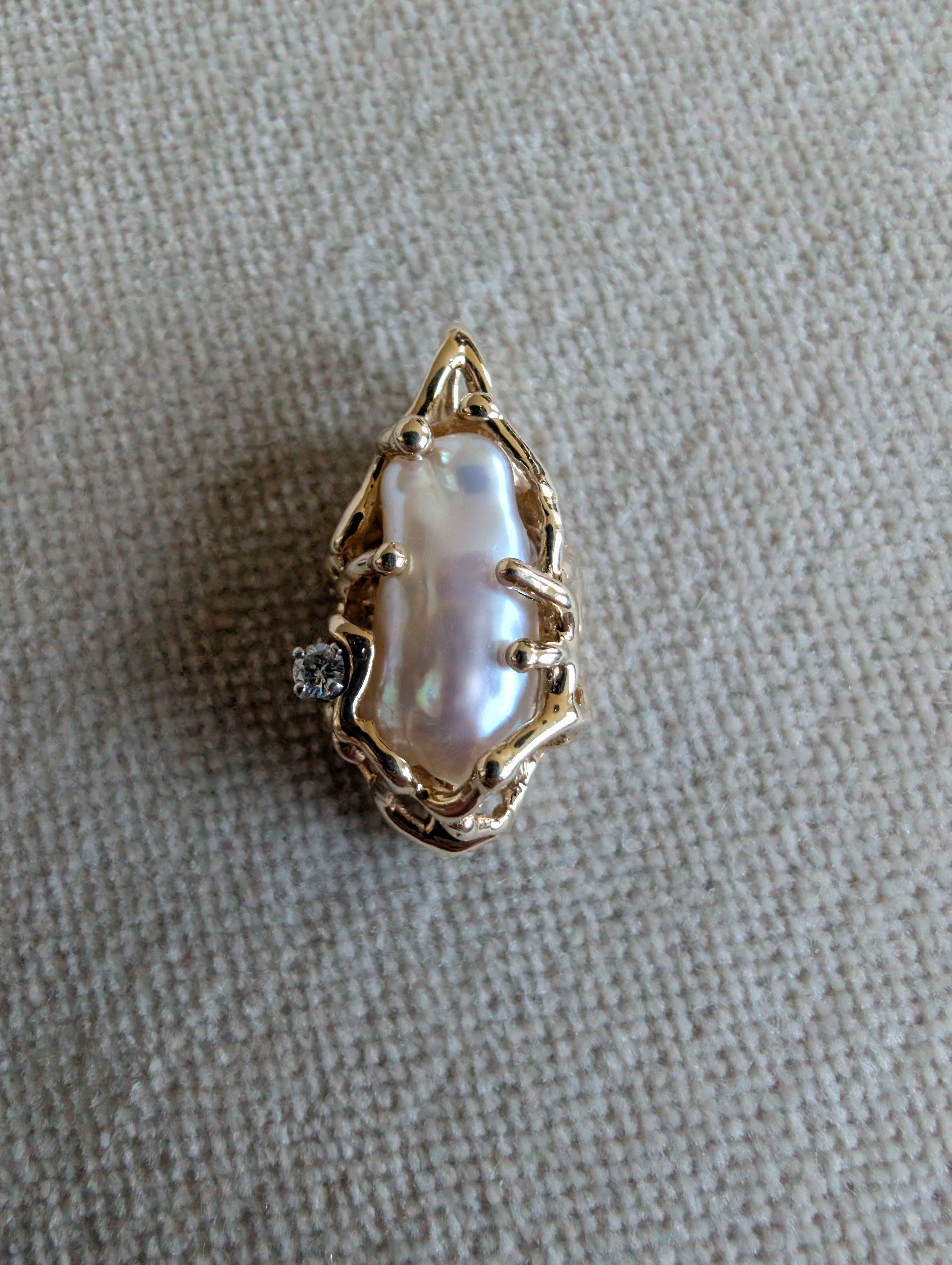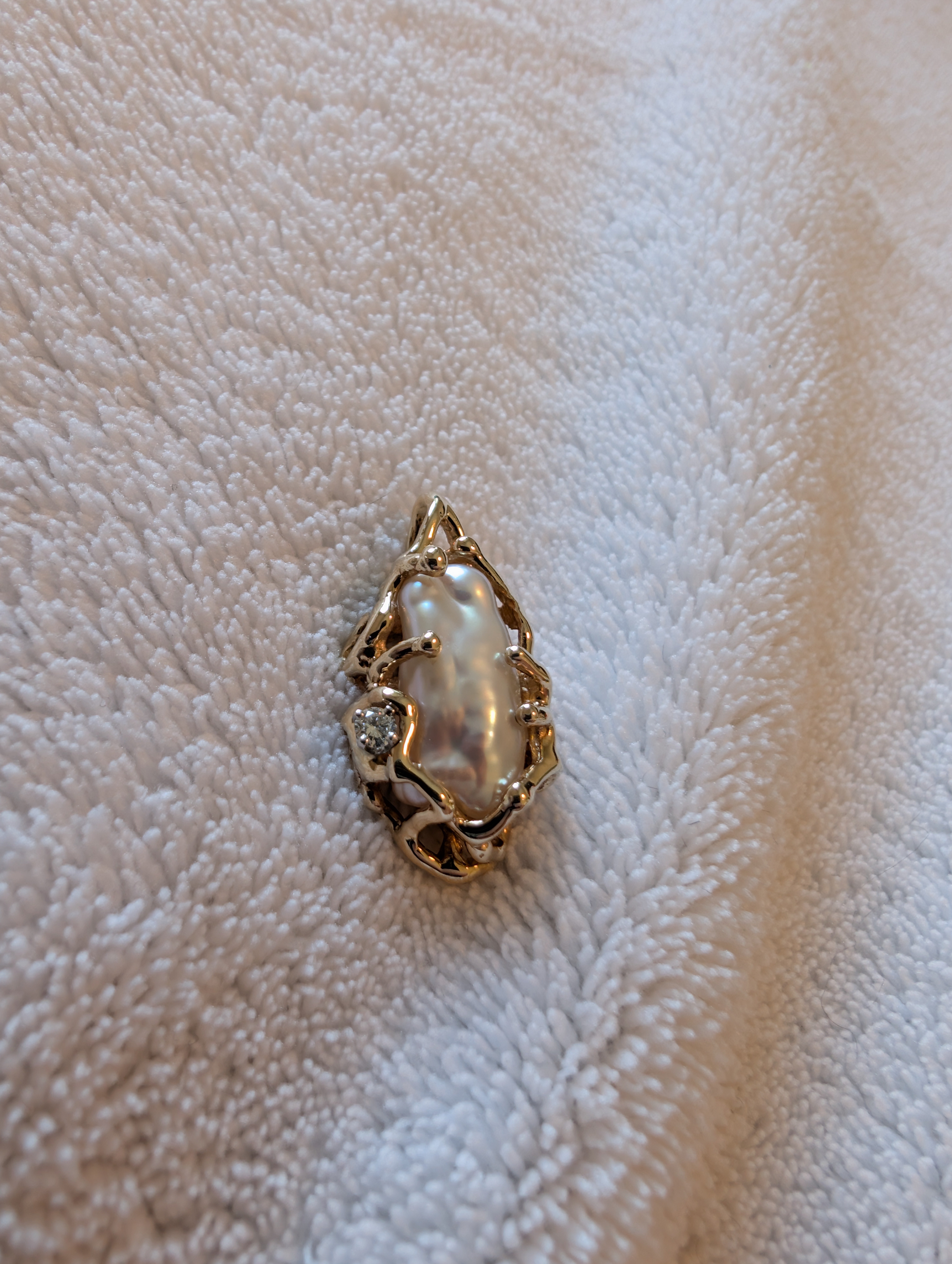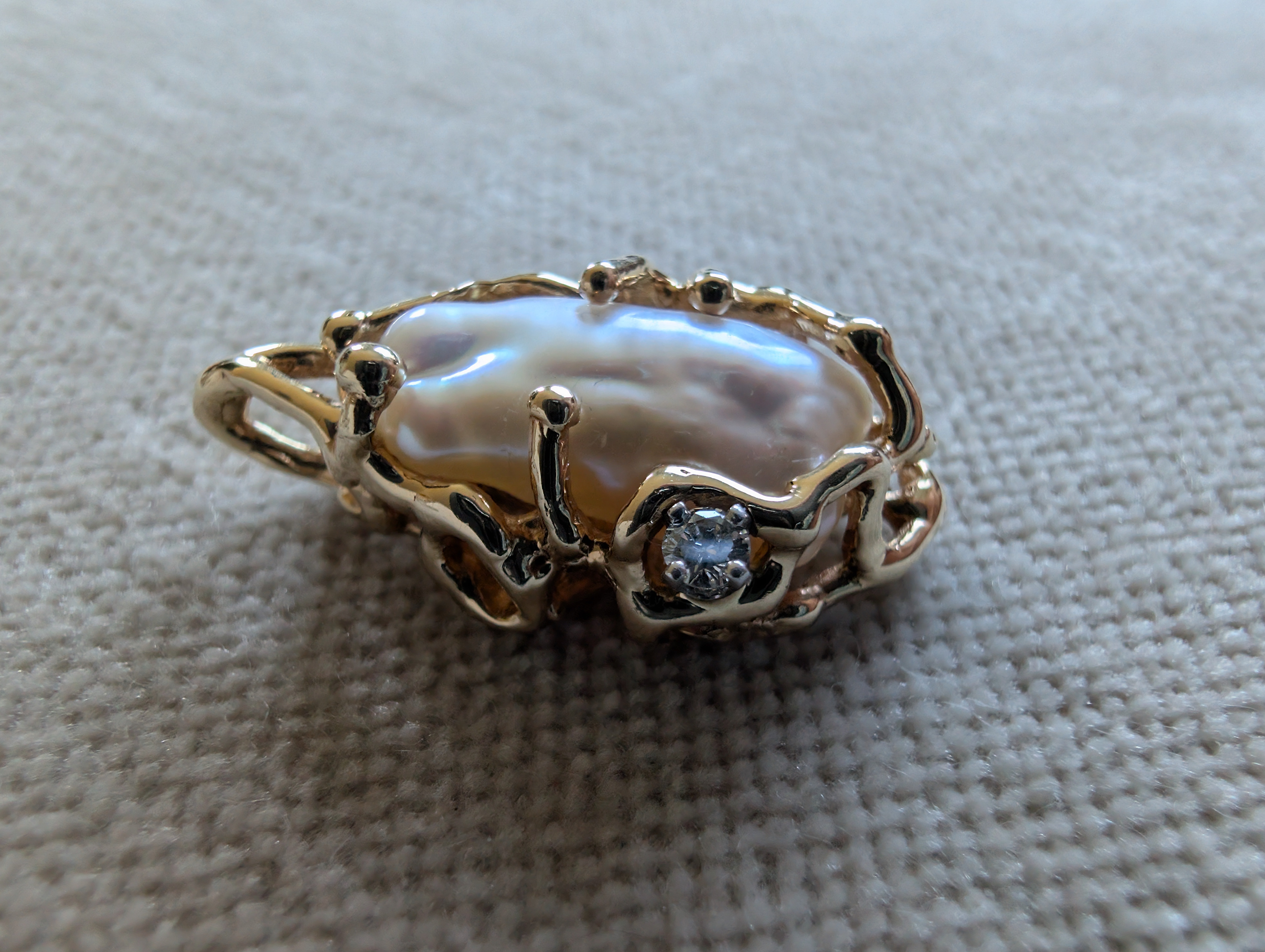 Little bit of background information. The pendant is custom made in the 1970s for my grandma in Vancouver Canada. It's set in 14 K Gold has gas a natural accent diamond. The Pearl is 17 mm by 7 mm by 5 mm deep. I've been told that's quite large and rare for a freshwater Keshi from the 70s so I'm wondering if it's Salt water
